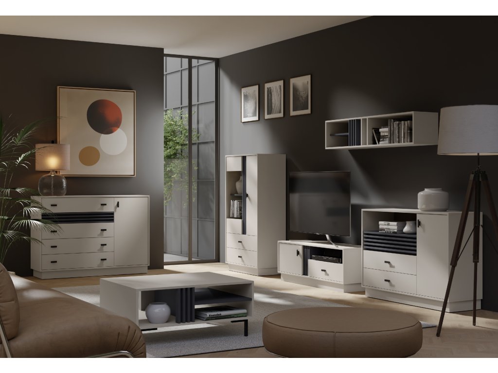 Provedení v kašmírově béžové barvě doplňují kontrastní antracitové lamelové detaily a černé úchytky, které podtrhují moderní vzhled kolekce Allmo. Komoda stojí na stabilním soklu, což jí dodává pevný charakter a zároveň působí elegantně a nadčasově.