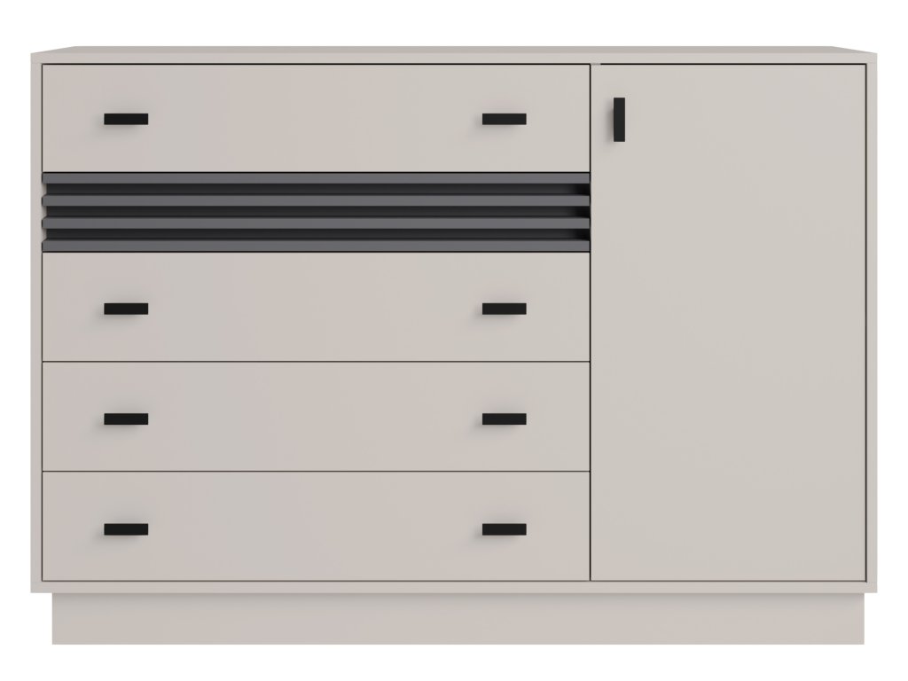 Široká komoda Allmo 17 – béžová s 5 zásuvkami a 1 skříňkou s dvířky nabízí dostatek úložného prostoru. Elegantní zpracování v kašmírově béžové barvě s antracitovými lamelami a černými úchyty.