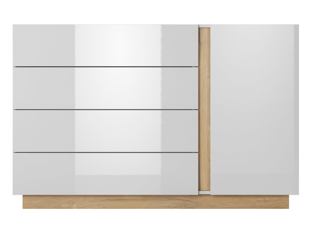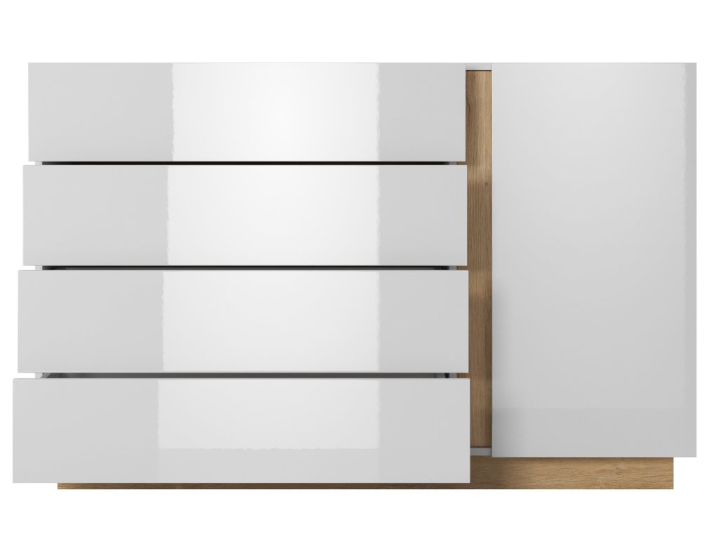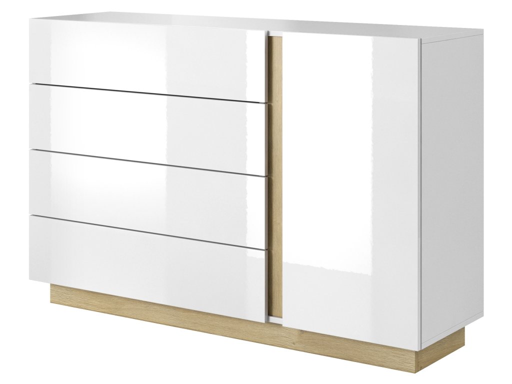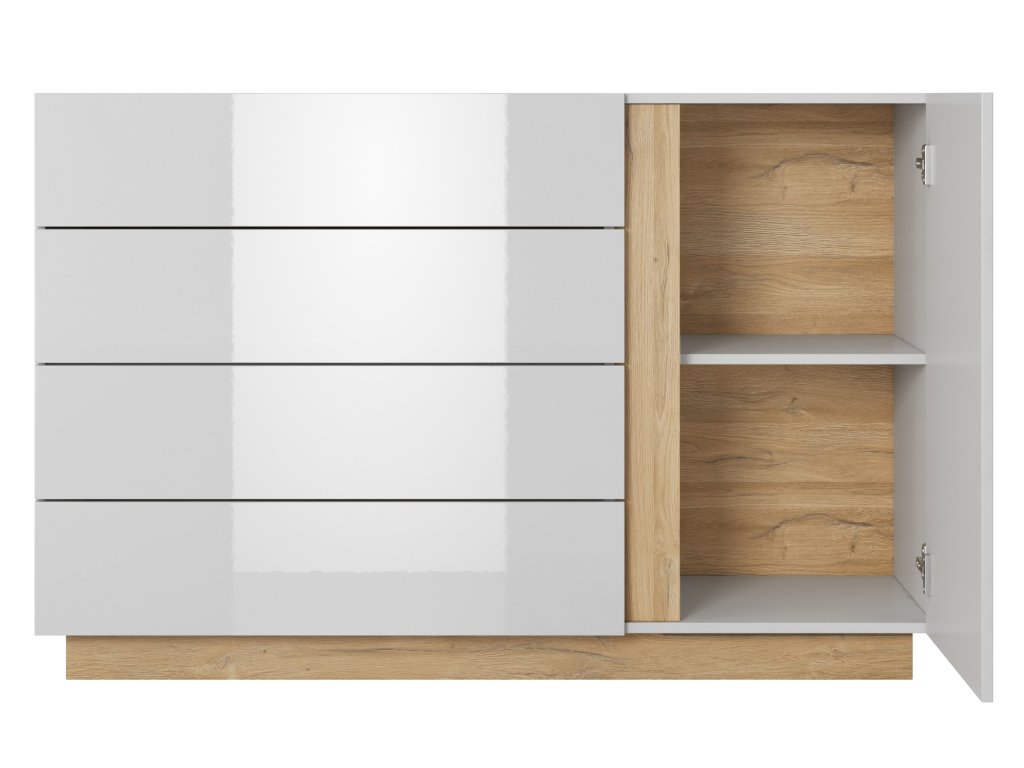 Široká komoda Arcon – bílý lesk / dub grandson přinese do vašeho interiéru eleganci a pořádek. Díky čtyřům prostorným zásuvkám a skříňce s policí získáte ideální prostor pro oblečení, doplňky či dokumenty. Moderní push-to-open systém a lesklý povrch s dubovým akcentem dělají z této komody stylový kousek, který zaujme na první pohled.