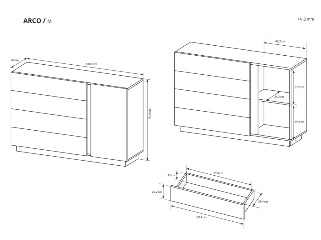 Komoda disponuje 4 prostornými zásuvkami ideálními pro uložení oblečení či doplňků a jedními dvířky, za kterými se ukrývá praktická police. Díky kombinaci zásuvek a skříňky máte vždy přehled v uložených věcech. Moderní systém push-to-open a decentní hliníkové úchytky dodávají nábytku minimalistický a nadčasový vzhled.