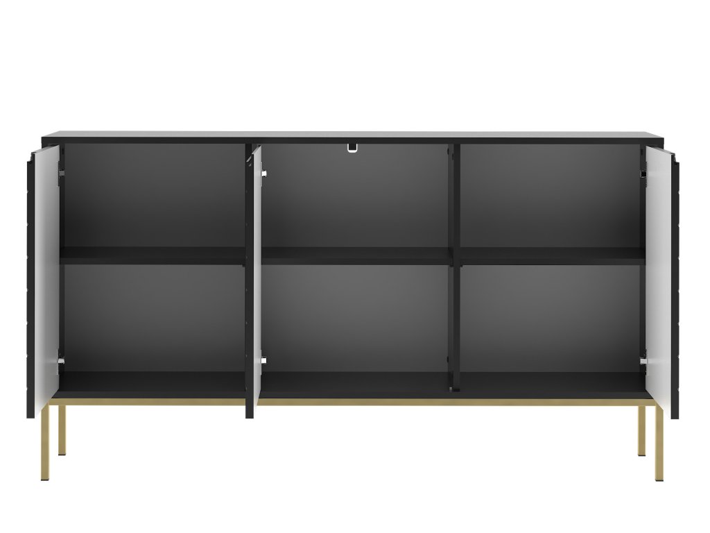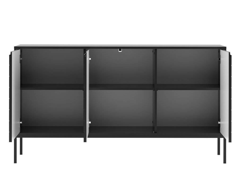 - Matná černá barva v kombinaci s jemným frézovaným stromečkovým vzorem dodává komodě dramatický a elegantní vzhled.
