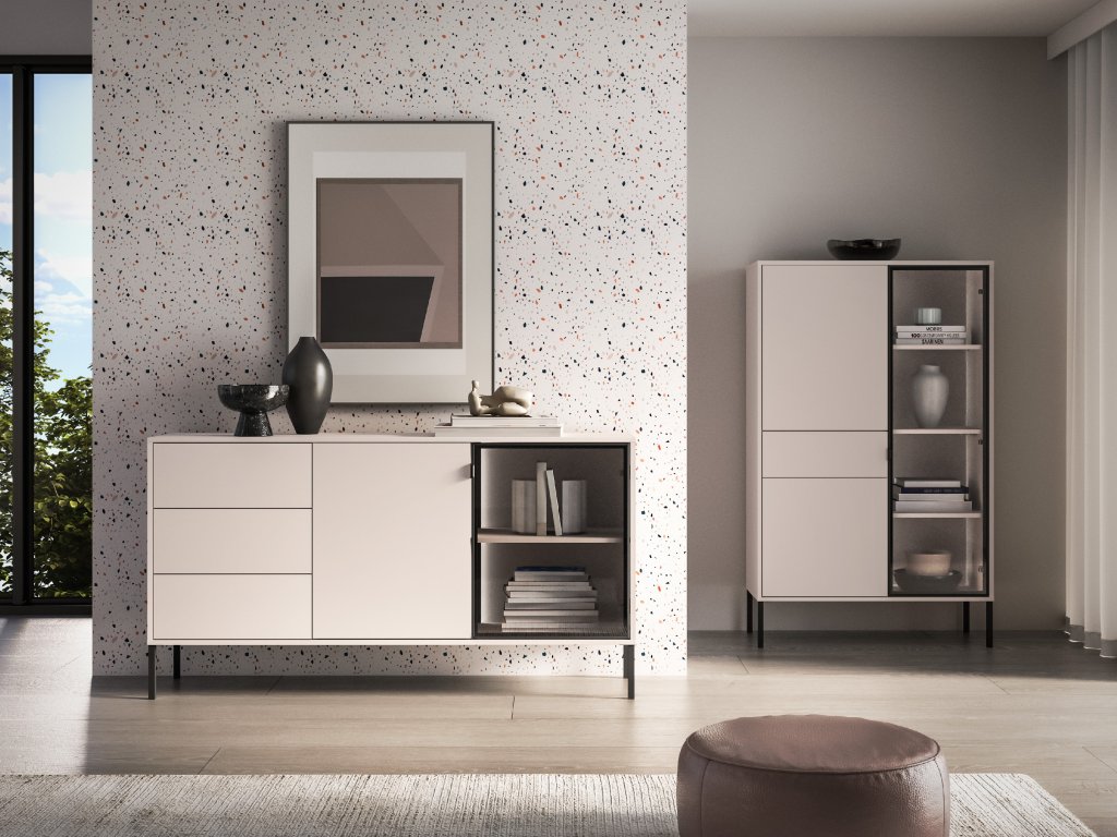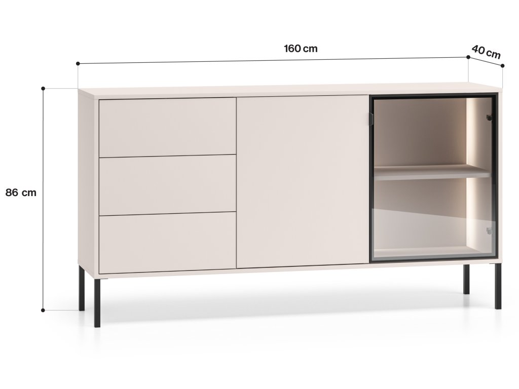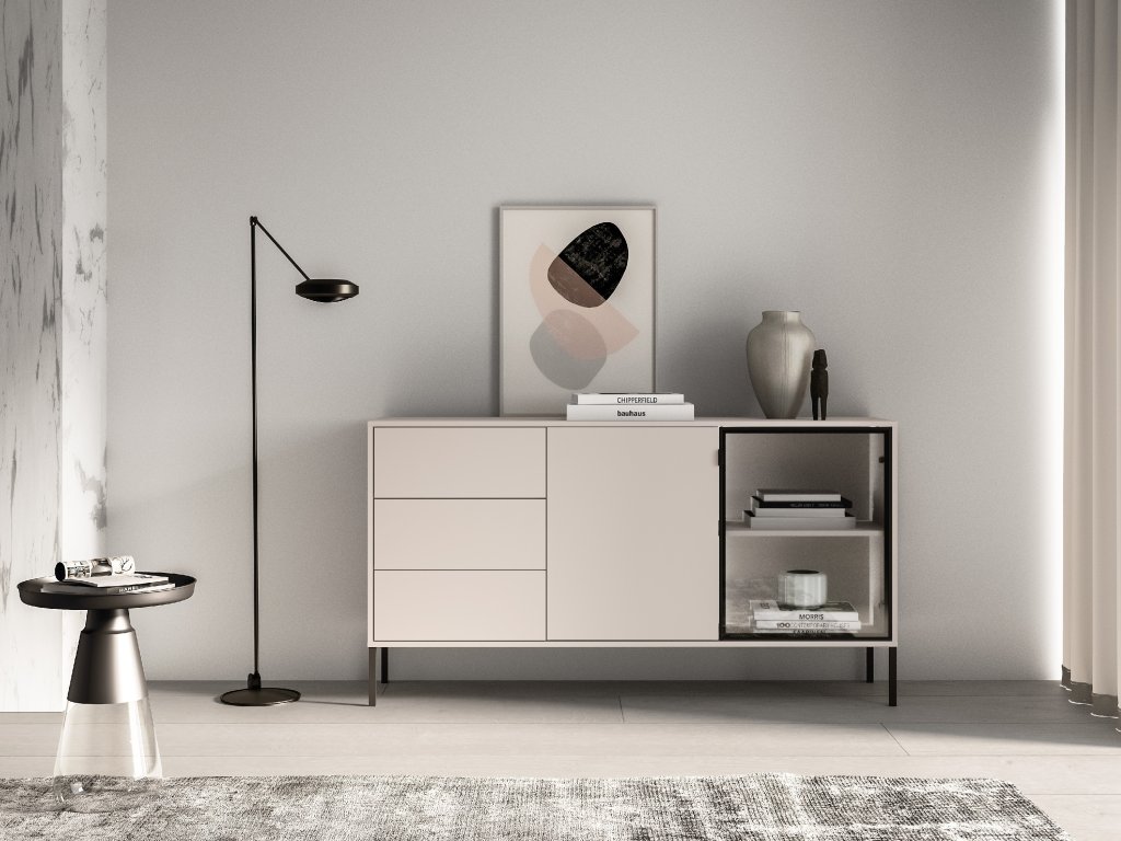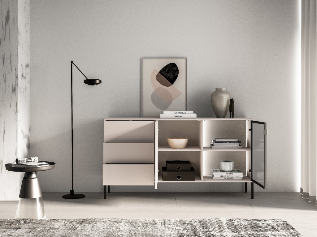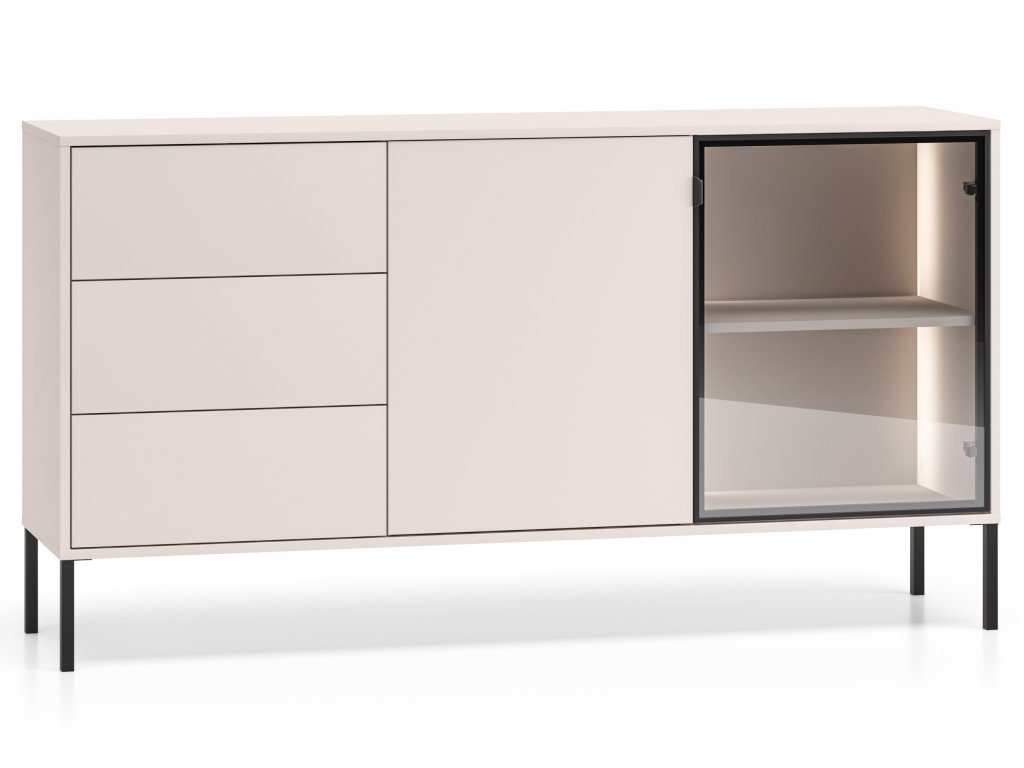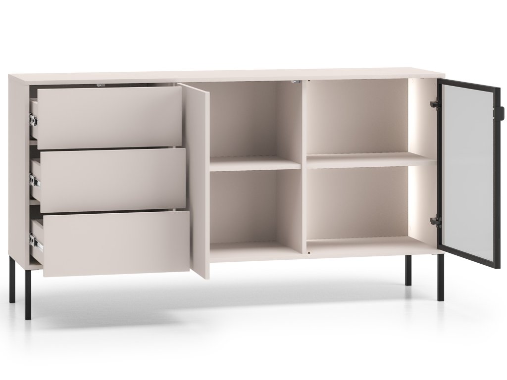 Komoda Barnee 02 v barvě kašmíru má lehký a nadčasový vzhled, přičemž si zachovává funkčnost kolekce Barnee. Kombinace zásuvek, uzavřeného prostoru a skleněné části nabízí variabilní využití. Osvětlená skleněná část dodává komodě elegantní nádech. Béžový povrch v kombinaci s černými prvky se hodí jak do moderních, tak do jemnějších interiérů.