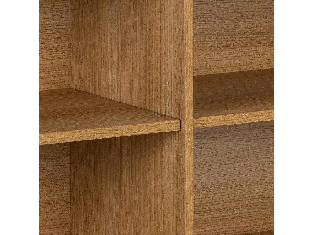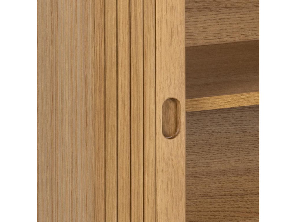 Z praktické stránky zaujmou posuvná „roletová“ dvířka – šetří místo před nábytkem a dodávají čelům čistý, nepřerušovaný vzhled. Uvnitř naleznete polohovatelné police, prostorné zásuvky či šatní tyč, takže úložný prostor si přizpůsobíte přesně podle potřeby. Kulaté dubové nohy s plstěnými podložkami zajišťují stabilitu a šetří podlahu, zatímco celodubové akcenty ucelí vzhled v každé místnosti – od obývacího pokoje, přes jídelnu až po ložnici.