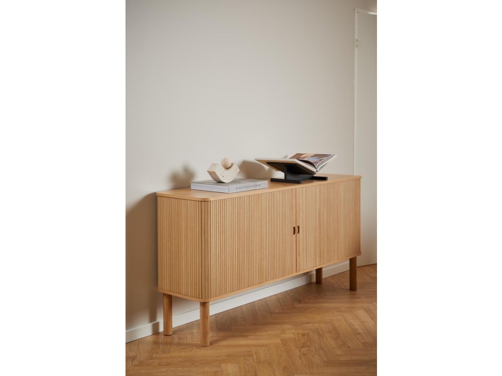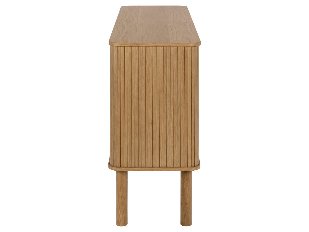 Prostorná komoda Langley spojuje moderní minimalismus s teplem přírodního dubu. Obdélníkové tělo se zaoblenými rohy odlehčují elegantní roletová dvířka s vertikálními lamelami, která působivě zdůrazňují kresbu dřeva. Uvnitř naleznete dvě výškově nastavitelné police, takže uložíte nádobí, textil i dekorace přesně podle potřeb. Celek spočívá na štíhlých, kulatých nohách z masivního dubu, které dodávají vzdušnost a chrání podlahu plastovými kluzáky.