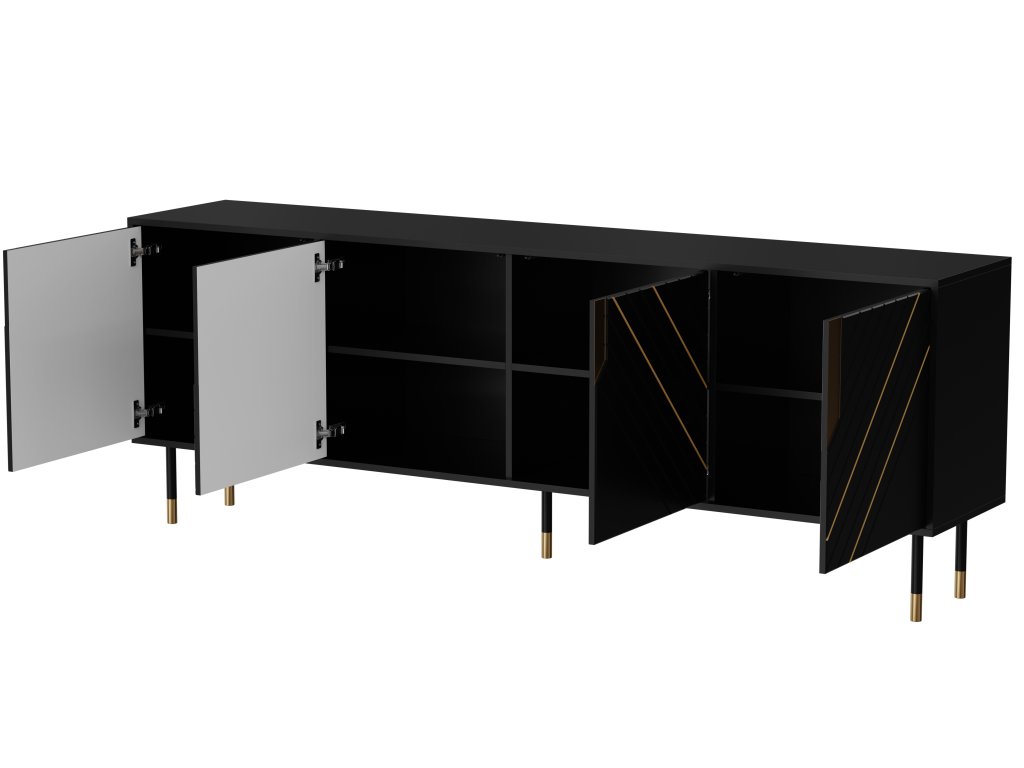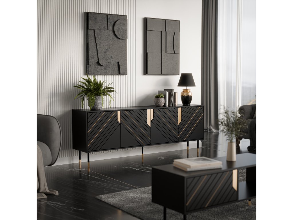 Tato široká a elegantní komoda nabízí čtyři dvířka, za kterými se ukrývá osm praktických úložných prostorů. Díky velkorysému vnitřnímu rozdělení poskytuje dostatek místa pro oblečení, textilie či domácí doplňky. Matná černá čela se šikmým frézováním, doplněná o zlaté aplikace, vytvářejí dojem luxusu bez zbytečné okázalosti. Ideální volba pro ty, kteří chtějí mít v interiéru pořádek, přehled i styl.