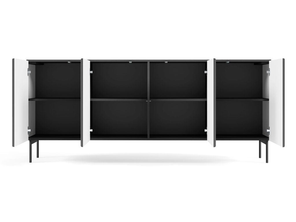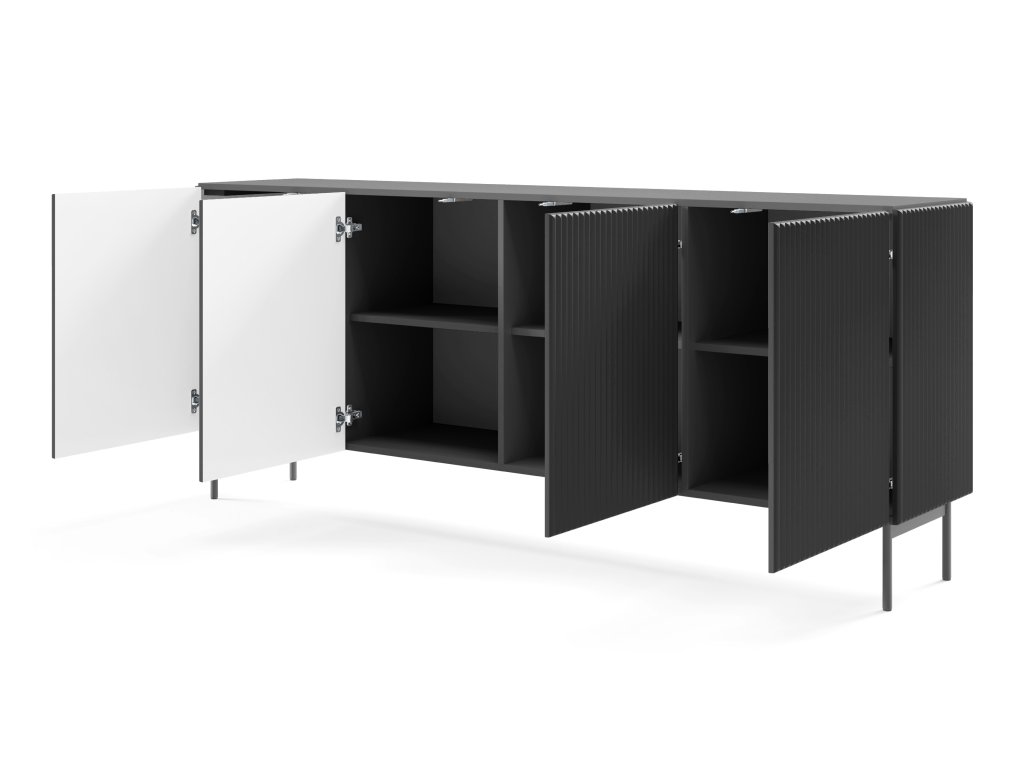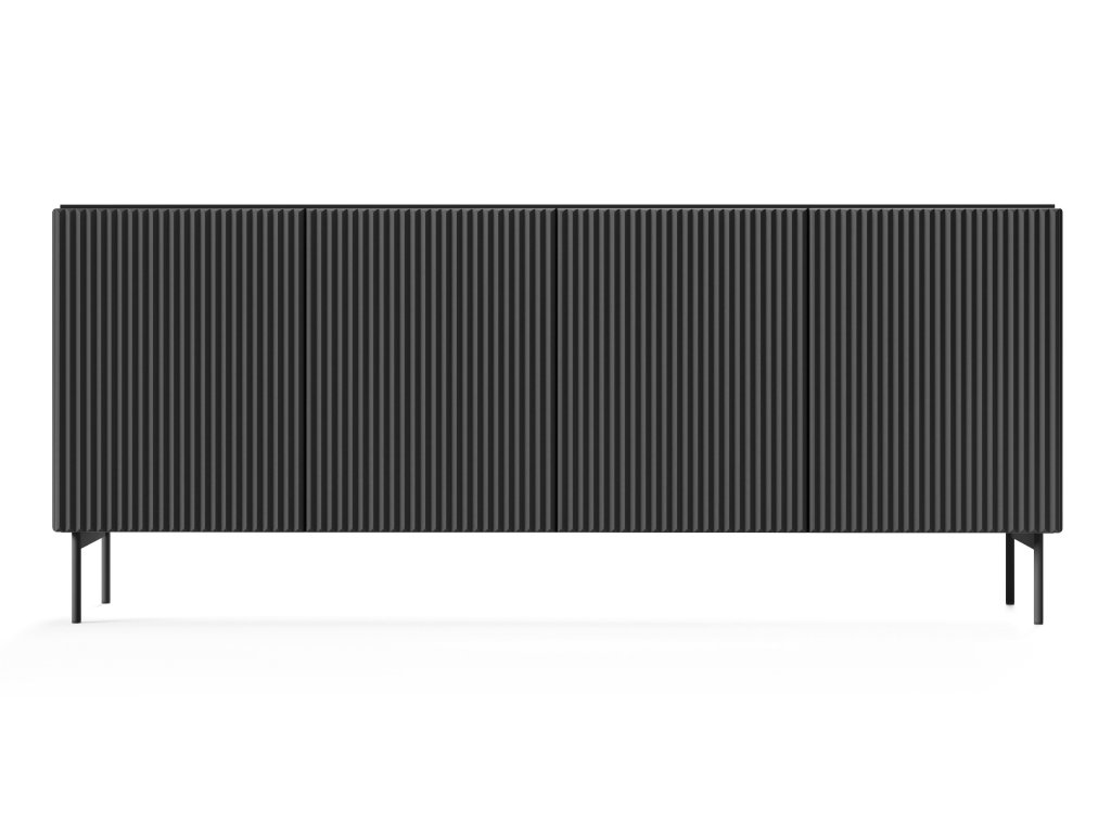 Široká čtyřdveřová komoda Muti B nabízí velký úložný prostor ukrytý za elegantními rýhovanými čely. Uvnitř najdete prakticky uspořádané police, ideální pro každodenní i sezónní předměty. Otevírání bez úchytek pomocí push-to-open systému podporuje moderní čistý design. V kombinaci s černýma kovovými nohama působí komoda pevně, stylově a nadčasově.