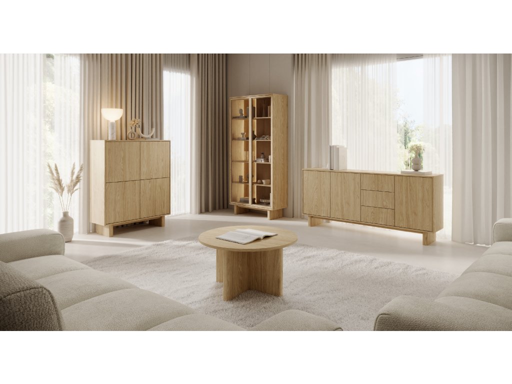 Komoda disponuje tromi zásuvkami a tromi skrinkami s policami, ktoré ponúkajú prakticky rozdelený úložný priestor. Vyhotovená je v dekore dub olejovaný s dôrazom na zaoblené hrany a moderné prevedenie. Otváranie je riešené pomocou push-to-open systému bez úchytiek.