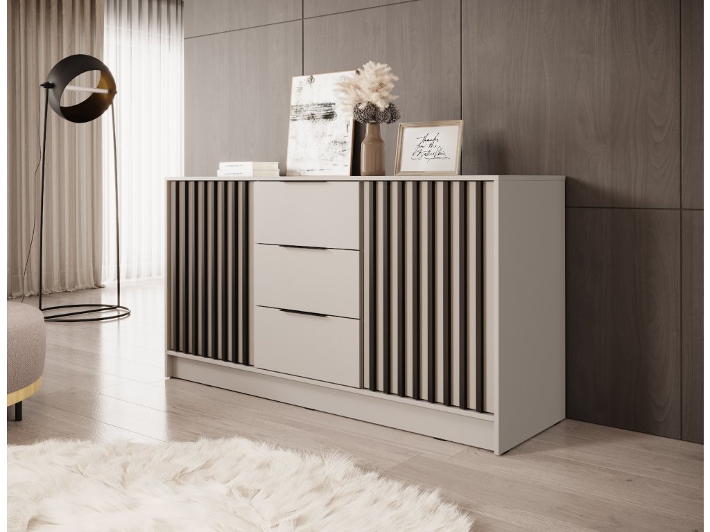 Komoda Nelly K3 nabízí tři zásuvky a dvě skříňky s policemi, ideální pro moderní interiér. Jemná béžová barva doplněná o černé lamely vytváří elegantní kontrast. Díky kvalitním materiálům a praktickému členění je skvělou volbou do každé domácnosti. Spojení designu a úložné funkce v jednom kuse nábytku.