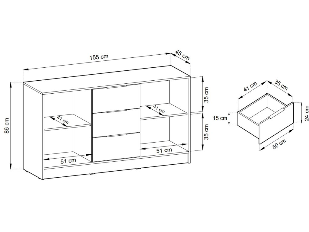 Komody i skříně jsou vyrobeny z laminované desky (16 mm) s ABS hranami a vybaveny praktickými úchyty z černého plastu. Vnitřní systém polic je uzpůsoben pro maximální flexibilitu: nastavitelné police (nosnost 3 kg), pevné police (5 kg), zásuvky o nosnosti 2–3 kg podle typu. Díky široké nabídce kolekce Nelly, rozměrů jednotlivých prvků a nástaveb si můžete vyskládat ideální sestavu přesně pro váš prostor.