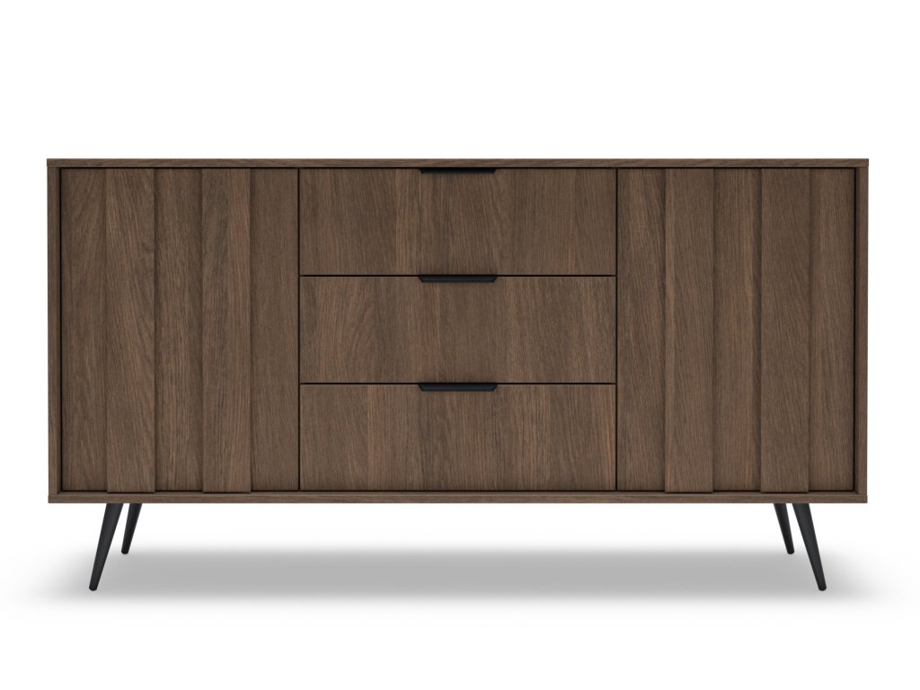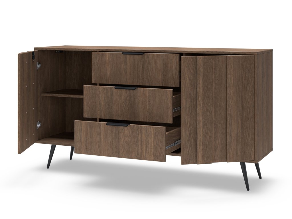 Komoda disponuje tromi zásuvkami v strednej časti a dvomi skrinkami s dvierkami po bokoch, ktoré poskytujú prakticky rozdelený úložný priestor. Vyhotovená je v dekore dub tmavý (dunin) s dôrazom na moderné prevedenie s MDF lištami na frontoch. Súčasťou je LED osvetlenie integrované vo frontoch. Stabilitu zabezpečujú kovové nohy v čiernej farbe.