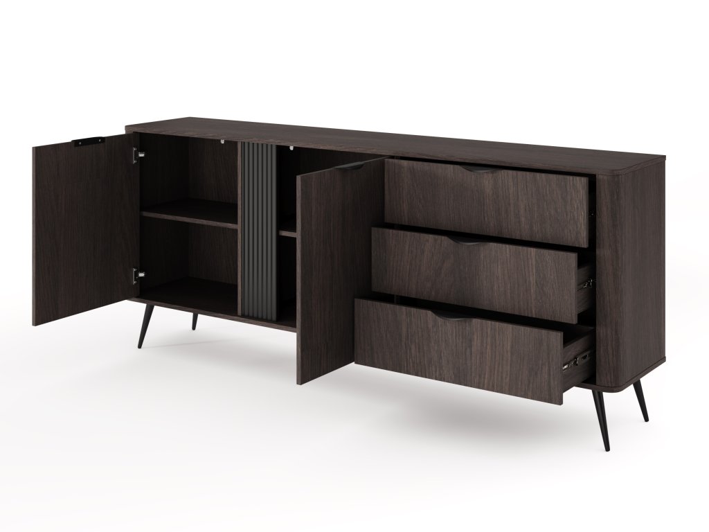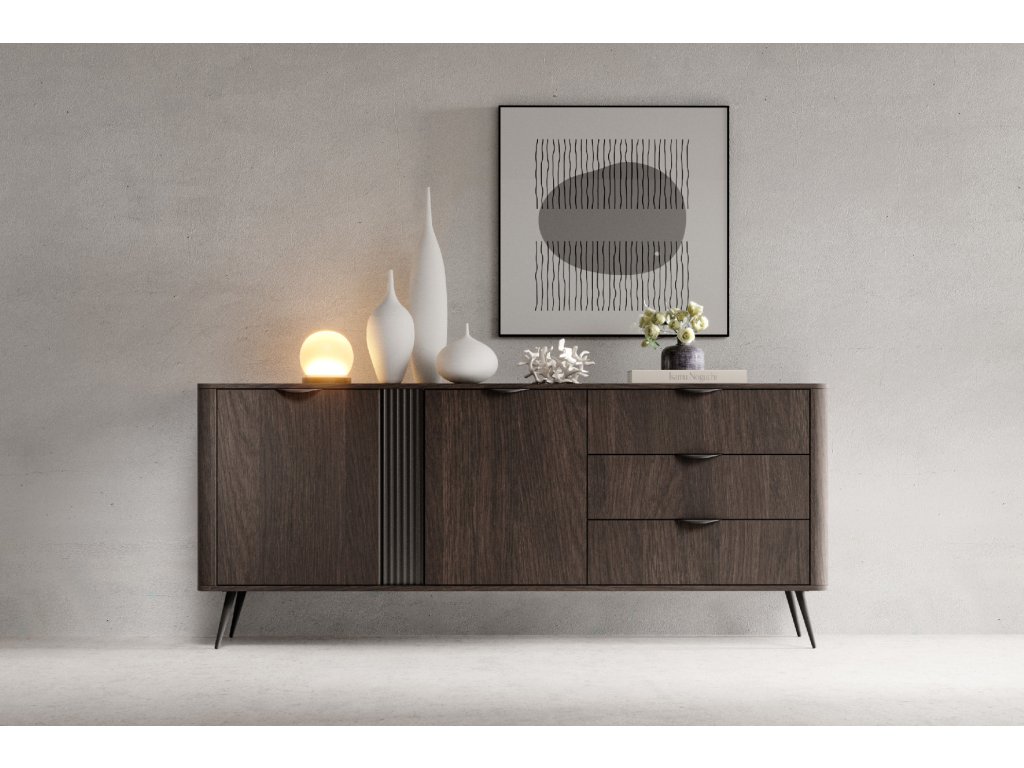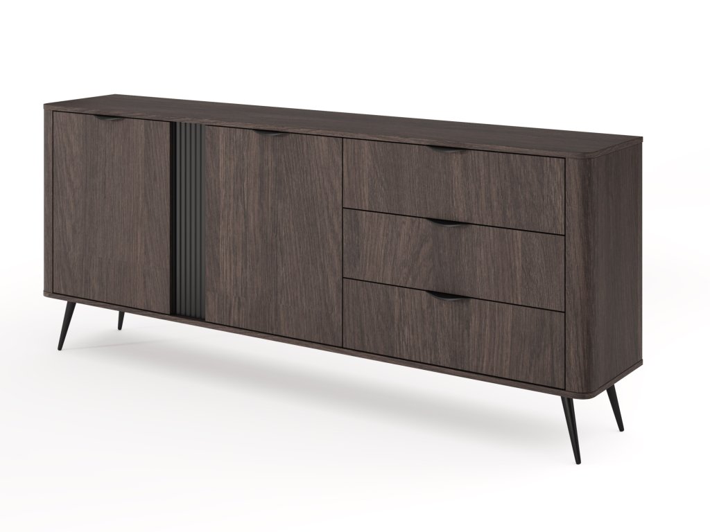 Široká komoda Veris D nabízí dokonale vyvážené spojení zásuvek a úložného prostoru za dvířky, čímž vytváří funkční i vizuálně působivý kus nábytku. Na jedné straně se nacházejí tři zásuvky, ideální na drobnější předměty, textilie či dokumenty, zatímco druhá polovina patří dvoudveřové skříňce s policemi pro uložení objemnějších věcí. Charakter komody podtrhuje rýhovaná černá MDF lišta, která kontrastuje s hlubokým odstínem tmavého dubu dunin. Elegantní kovové úchytky v černé barvě, kovové nožičky a zaoblené MDF boky uzavírají design, který působí robustně, ale zároveň vyváženě.