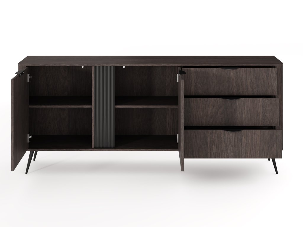 Široká komoda Veris D kombinuje tři zásuvky a dvoudveřovou skříňku s policemi, v elegantním tmavém dekoru dub dunin. Černé detaily jako rýhovaná MDF lišta, kovové nožičky a úchyty vytváří silný kontrast a moderní vzhled. Vhodná do obývacího pokoje, pracovny i ložnice. Designový a funkční kousek v jednom.