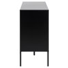 Za třemi zásuvkami a za dvířky s nastavitelnou policí se ukrývá překvapivě velkorysý úložný prostor na nádobí, textilie či dokumenty. Povrchy z PU lakované MDF a melaminu se čistí vlhkým hadříkem, práškový lak na oceli odolá škrábancům a plastové krytky ochrání podlahu. Nosnost vrchní desky 31 kg bez obtíží unese lampu, rostliny i oblíbené dekorace.