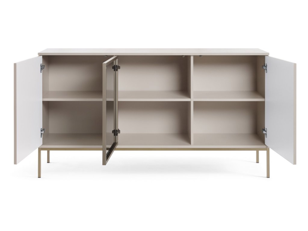 Třídveřová komoda Sento vás přesvědčí o tom, že kvalitní nábytek se doma vyplatí mít. Je vyrobena v originálním designu, který dotváří detaily jako frézovaná dvířka a tvrzené černé sklo v hliníkovém rámu. Komoda stojí na kovových béžových nožičkách, které jí dodávají lehkost a jemnost.