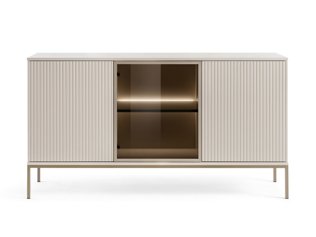 Moderní široká komoda Sento v kašmírově béžové barvě přinese do každého interiéru nádech sofistikovanosti. Kombinace kovových detailů, skleněných ploch a hladkého povrchu nábytkové desky vytváří harmonický celek, který působí moderně, ale zároveň jedinečně. Tento designový kousek rozhodně nezůstane bez povšimnutí.