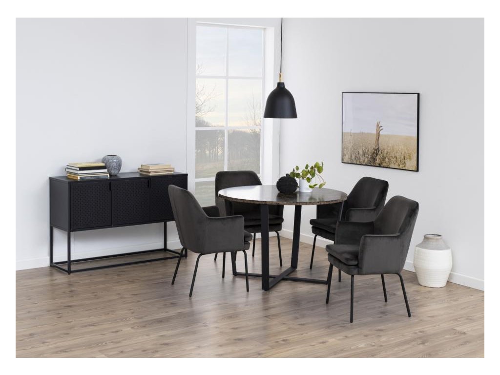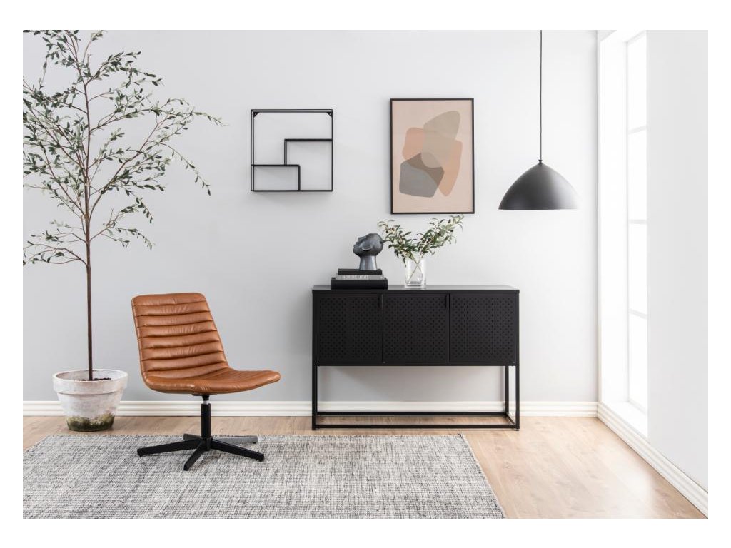 Komoda Newton je ztělesněním moderního industriálního designu – celokovová konstrukce, matná černá barva a výrazná kovová síťovina na dvířkách vytvářejí autentický industriální charakter. Díky širšímu formátu 120 × 40 × 80 cm nabízí více úložného prostoru, ale stále si zachovává vzdušný a čistý vzhled.