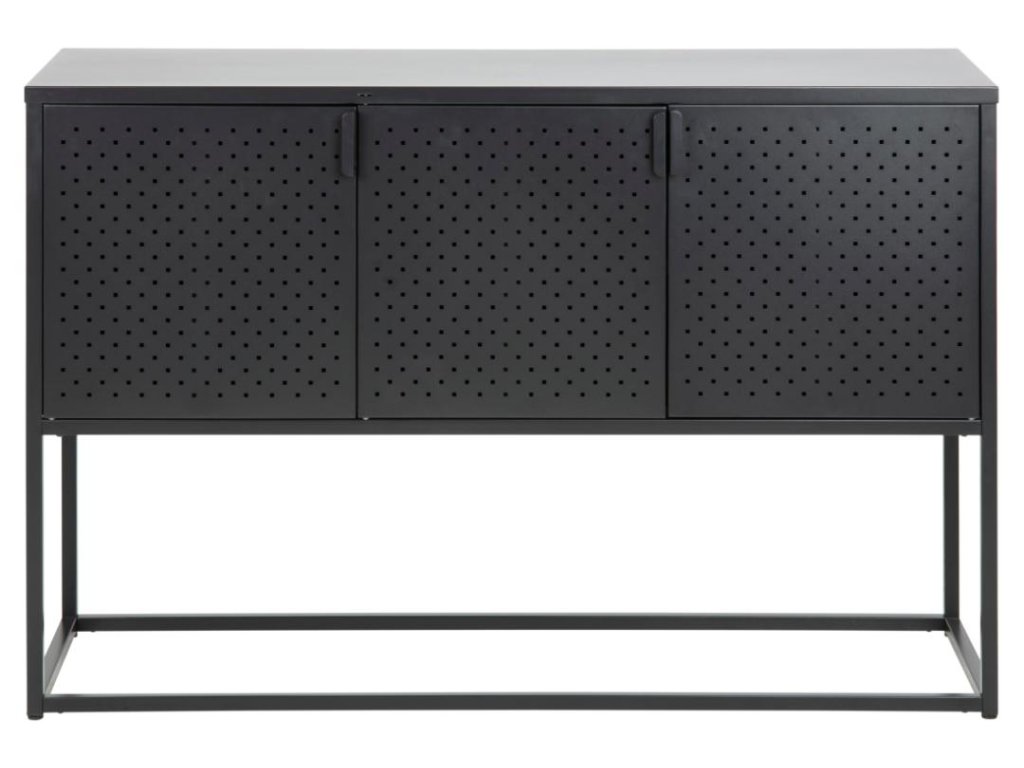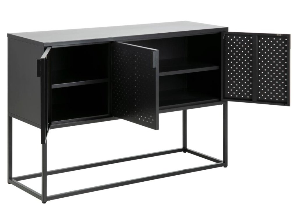 Industriální komoda Newton z matné černé oceli se třemi dvířky se síťovinou a dvěma policemi. Moderní, odolný a velmi praktický kousek, který přemění každý interiér.
