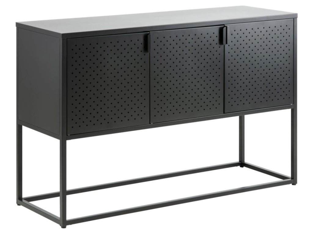 Za třemi dvířky se ukrývají dvě praktické police, ideální na nádobí, dekorace, dokumenty či doplňky do domácnosti. Hrubý práškový nástřik dodává komodě odolnost i moderní matný efekt. Díky úzkému profilu se skvěle hodí do chodby, obývacího pokoje, pracovny nebo jídelny.