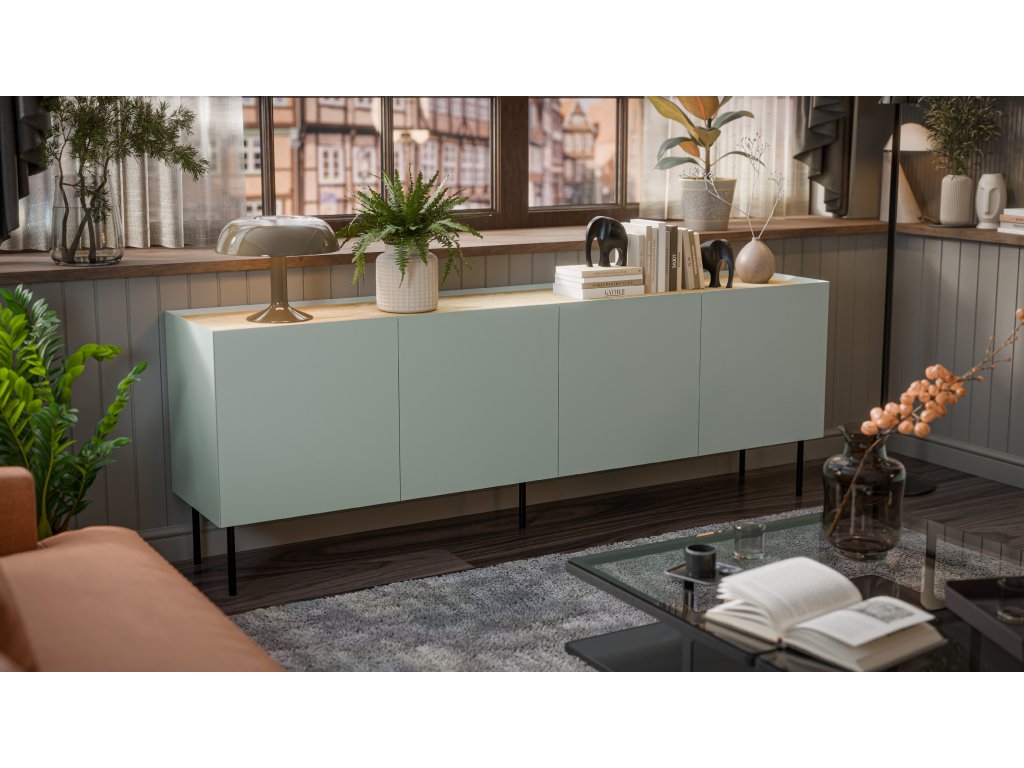 Komoda je vyrobena z lakované MDF desky tloušťky 16 mm v matném provedení, které působí elegantně a zároveň je odolné vůči každodennímu používání. Čtyři dvířka otevíraná směrem do středu ukrývají prostorné úložné prostory – ideální pro textilie, dokumenty či doplňky. Bezúchytové otevírání podtrhuje minimalistický design a usnadňuje manipulaci.