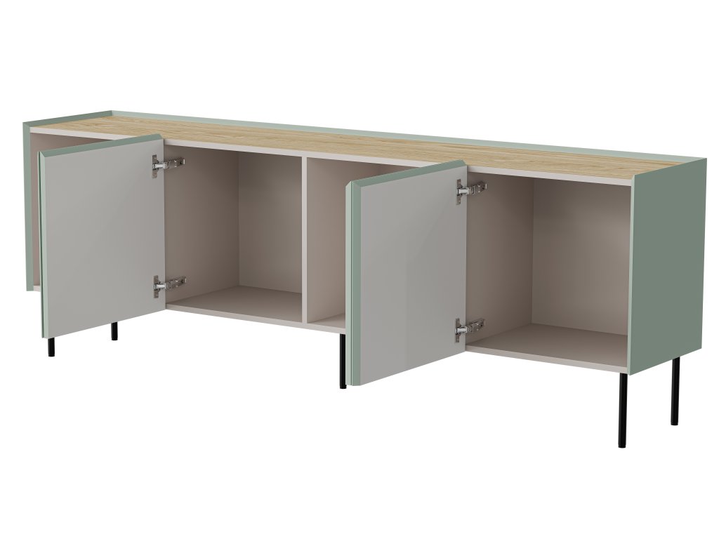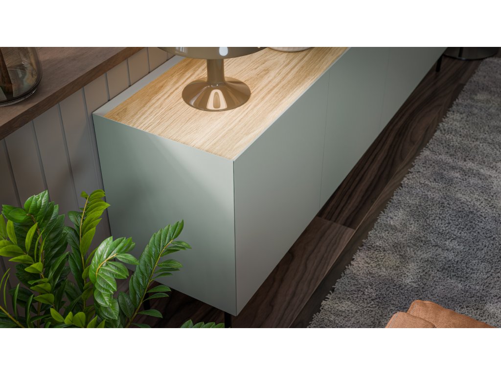 Elegantní komoda Fellini 200 v olivově zelené barvě spojuje moderní design s praktickým úložným prostorem. Kolekce Fellini se vyznačuje teplými a harmonickými odstíny, které do interiéru vnášejí klid a vizuální rovnováhu. Zapuštěná vrchní deska zvýrazňuje lehkost konstrukce, zatímco šikmé hrany dodávají komodě jemný a vytříbený charakter.