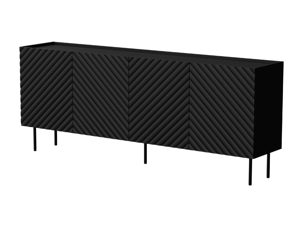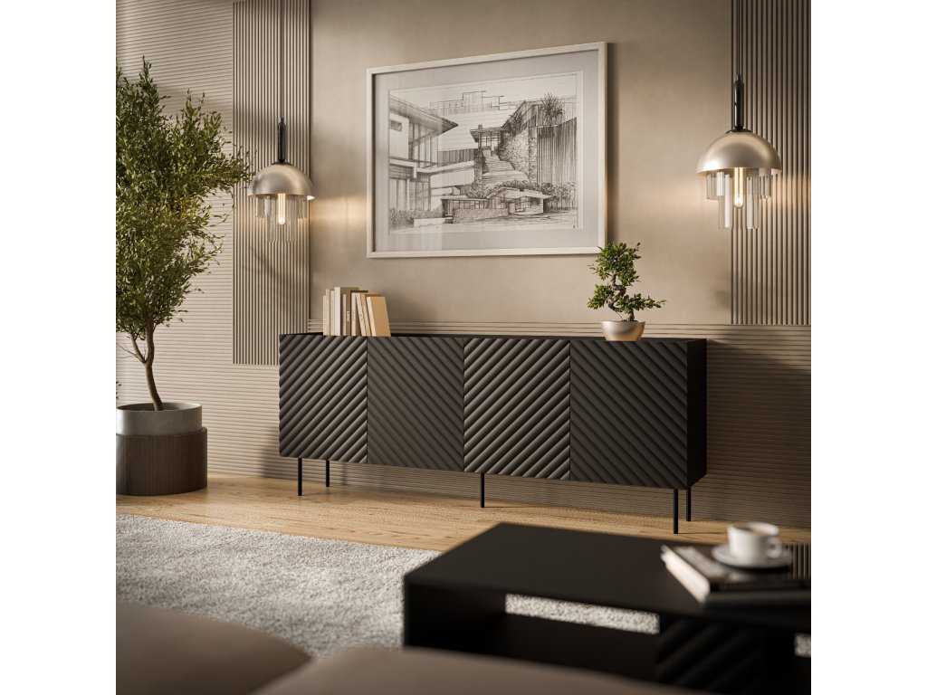 Černá verze komody Lucia 200 je výrazná a stylově sebevědomá. Je vhodná jako dominantní prvek v místnosti – ať už v obýváku, ložnici nebo pracovně. Čisté linie bez úchytek působí moderně a elegantně. Perfektní řešení pro interiéry s kontrastem.