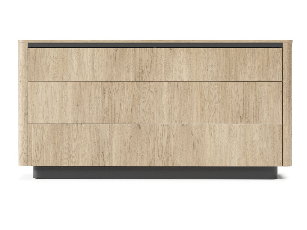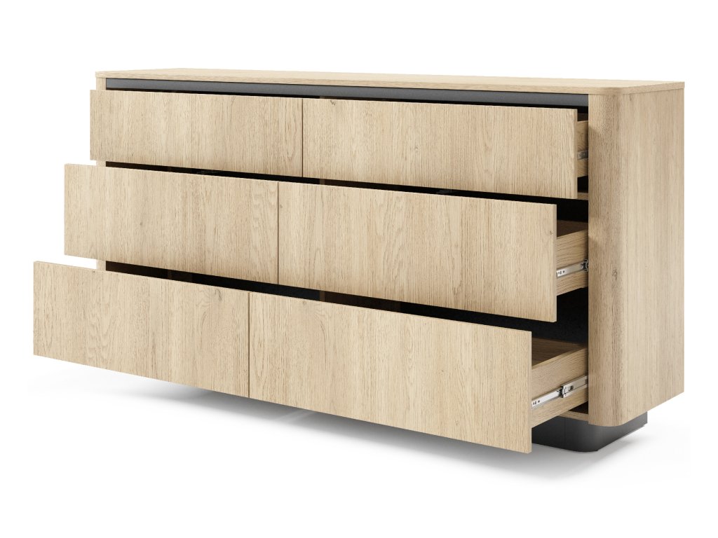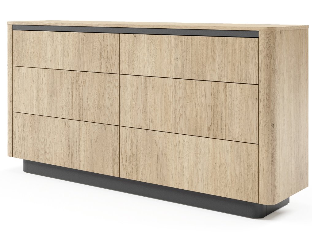 Zásuvková komoda Toros D nabízí šest prostorných zásuvek s elegantním push-to-open otevíráním bez úchytek. Kombinace dekoru dub krémový a černých prvků působí moderním a kontrastním dojmem. Zaoblené lišty a černý sokl dodávají komodě osobitý styl. Ideální volba pro každého, kdo hledá úložný prostor s důrazem na design.