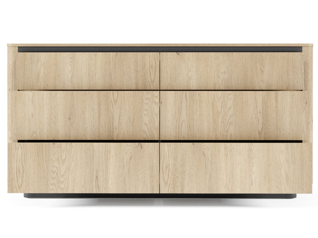 Zásuvková komoda Toros D je výbornou volbou pro každého, kdo hledá mnoho přehledného úložného prostoru bez kompromisů na designu. Nabízí šest širokých zásuvek, které jsou ideální pro uložení oblečení, prádla, dokumentů či jiných domácích potřeb. Díky push-to-open mechanismu se zásuvky otevírají snadno a bez úchytek, což podporuje čistý a elegantní vzhled celé komody. Světlý dekor dub krémový je dokonale vyvážený černými prvky, jako jsou zaoblené boční lišty, dekorační horní pás a spodní sokl, které vytvářejí kontrast a dodávají nábytku výraz.
