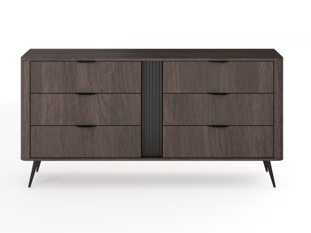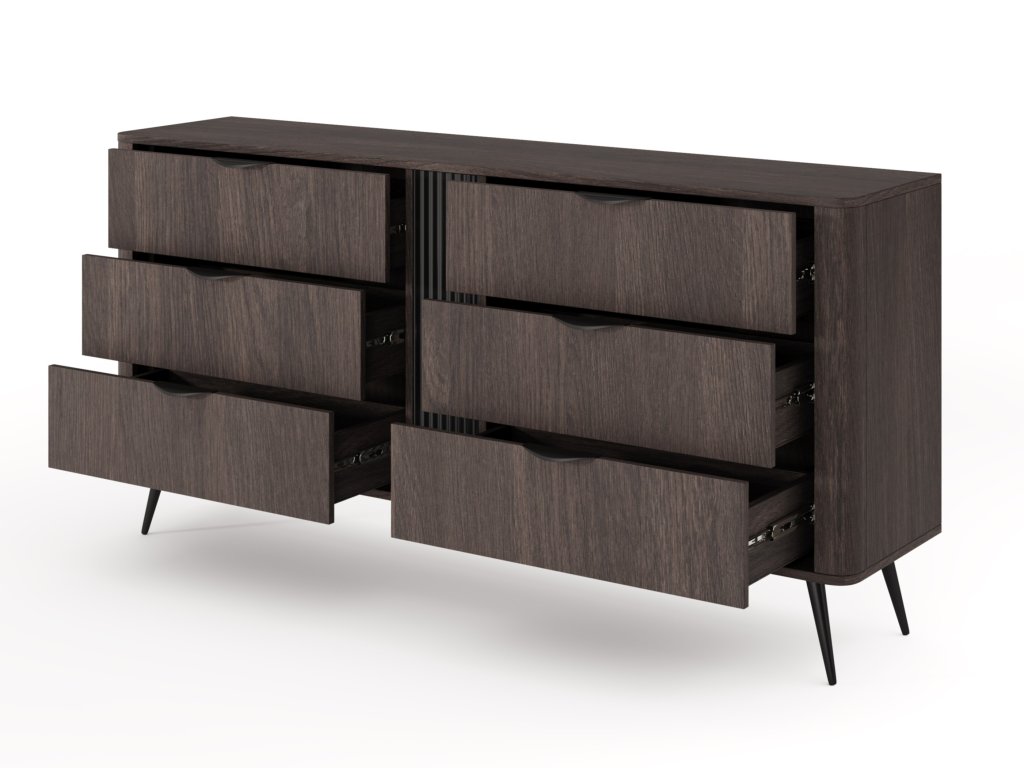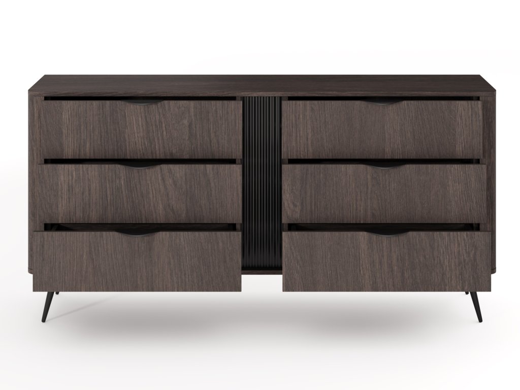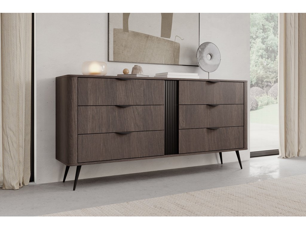 Zásuvková komoda Veris C nabízí šest zásuvek s plnovýsuvem a elegantními černými kovovými úchyty. Dekor dub tmavý je doplněn o kontrastní prvky jako rýhovaná MDF lišta a kovové nožičky. Díky svým proporcím je ideálním řešením do ložnice, obývacího pokoje či pracovny. Stylový, robustní a praktický kus nábytku s charakterem.