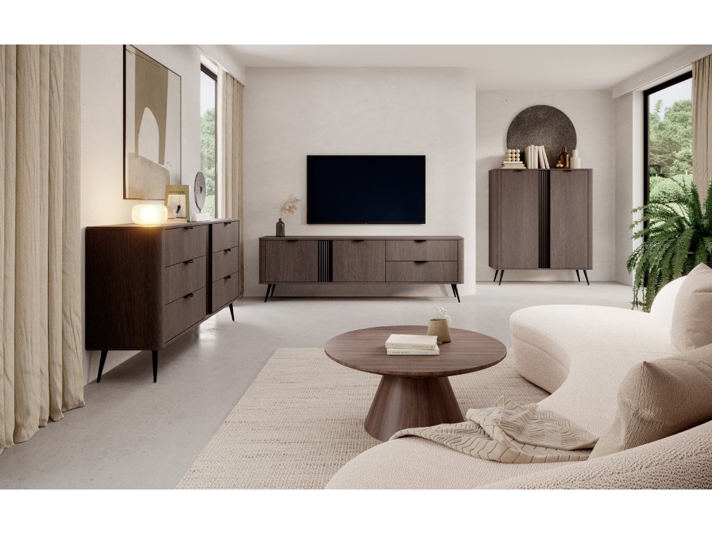 Veris je kolekce navržená pro ty, kteří hledají tmavší dřevěné odstíny a silný vizuální dojem, ale zároveň ocení praktičnost a kvalitu. Dekor tmavého dubu dunin má hřejivý, ale výrazný charakter a je doplněn o černě rýhované MDF lišty, které vytvářejí efekt strukturovaného rytmu. Kovové nožičky a úchyty, zaoblené boční lišty, plnovýsuvné zásuvky, ABS hrany a barevně sladěná HDF výplň zaručují nejen estetiku, ale také dlouhodobé pohodlí při používání. Kolekce Veris je ta, která se hodí do interiérů, kde má nábytek dominovat, ne splynout.