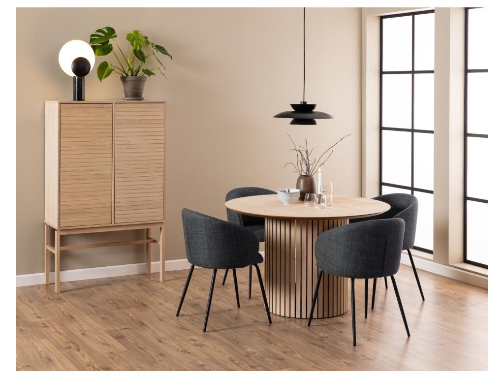 Kolekce Linley staví na světlém, olejovaném dubovém základu s jemným bílým pigmentem, který rozjasní prostor a zachová přirozenou kresbu dřeva. Charakteristickým motivem je lamelový dekor – ať už na sloupové podnoži kulatého stolu, nebo na čelech dvířek skříněk a vitrín. Všechny kusy mají čisté linie, zaoblené hrany a diskrétní mechanismus push-to-open, takže působí nerušeně v moderním bytě, ale stejně dobře zapadnou i do klasické jídelny.