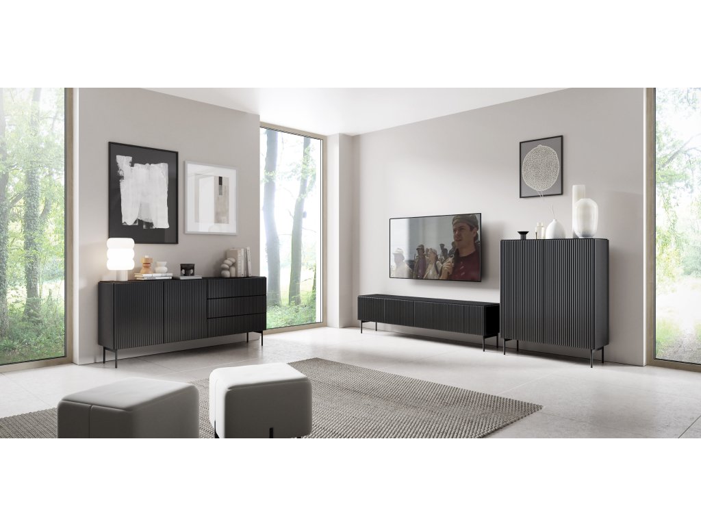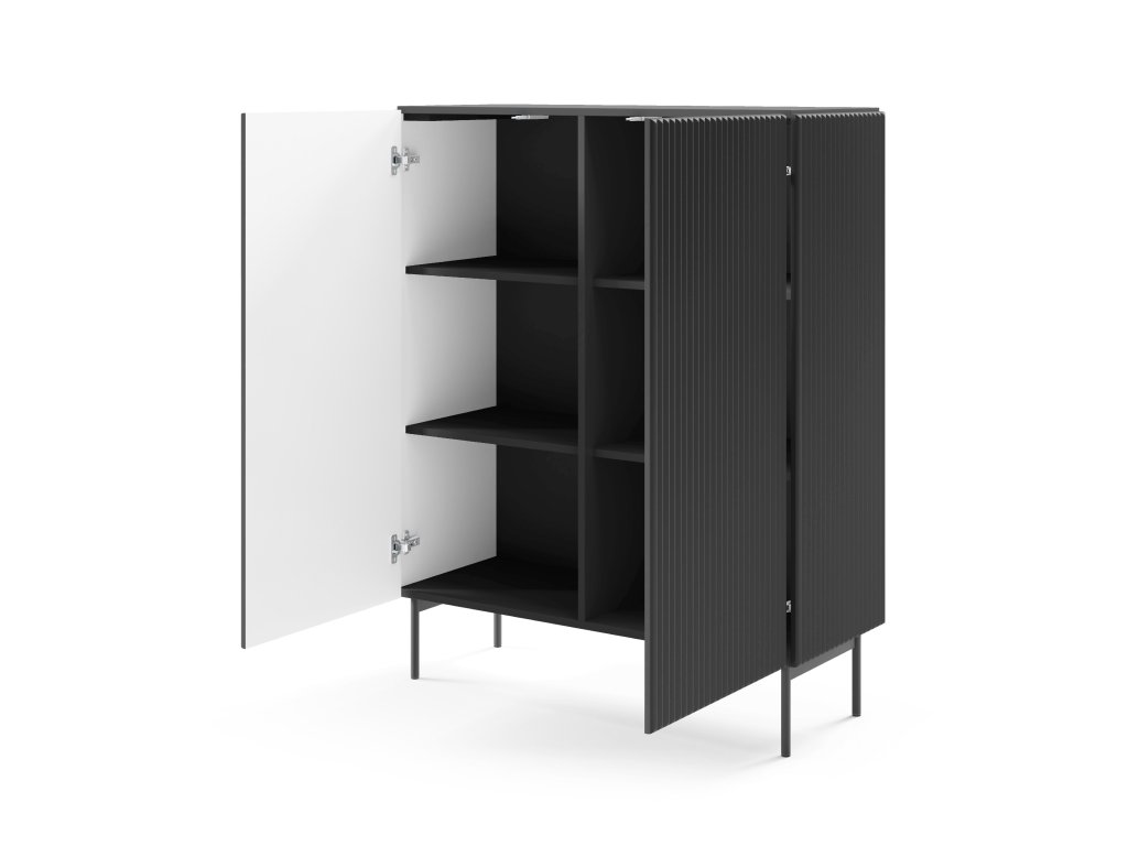 Vysoká komoda Muti A je stylový a funkční kus nábytku navržený pro ty, kteří hledají dostatek úložného prostoru v elegantním černém provedení. Dvoudveřová komoda skrývá za plnými čely prakticky členěné police, ideální pro uložení nádobí, textilií, dokumentů či doplňků. Díky systému push-to-open se dvířka otevírají lehkým zatlačením, čímž se zachovává čistý a minimalistický vzhled bez úchytek. Rýhovaná čela a boční panely z MDF dodávají nábytku charakter a vizuální hloubku, zatímco celkový design působí moderně, ale zároveň nadčasově.