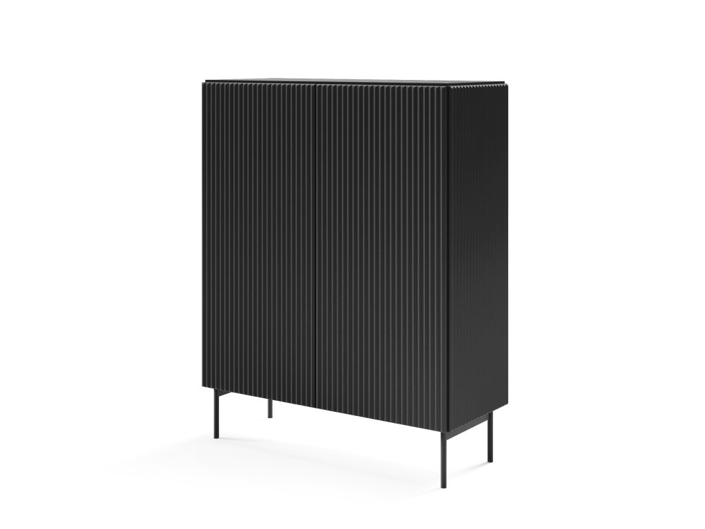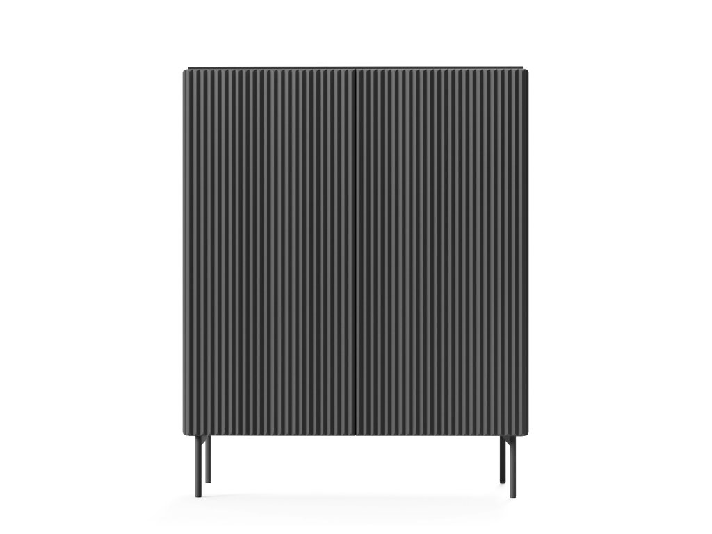 Černá vysoká komoda Muti A nabízí elegantní řešení úložného prostoru v moderním rytmickém designu. Dvoudveřová komoda ukrývá několik praktických polic a otevírá se systémem push-to-open, bez rušivých úchytek. Rýhovaná čela a boční panely z MDF vytvářejí luxusní, plastický efekt. Ideální do moderních obýváků, kde má dominovat styl, jednoduchost a kvalita.