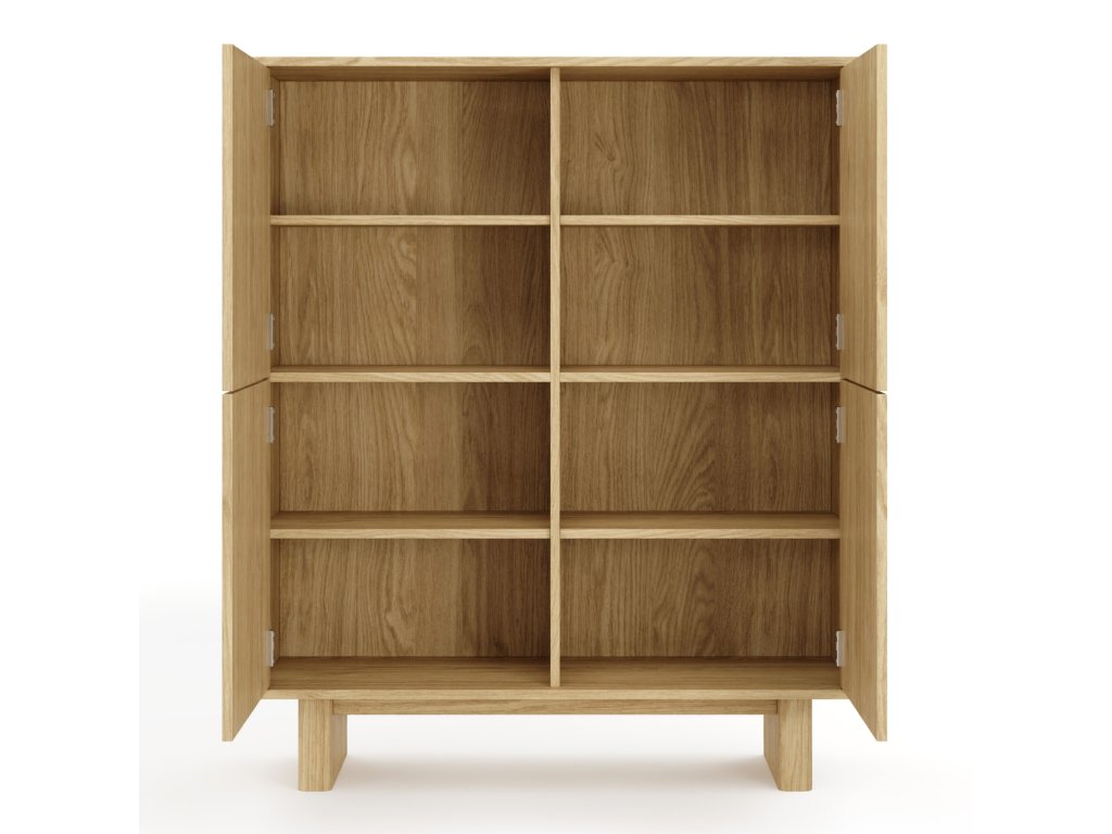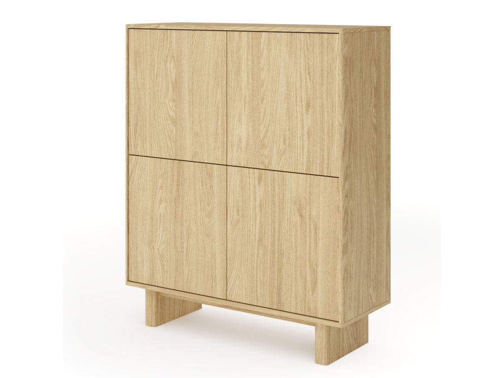 Komoda disponuje štyrmi dvierkami, za ktorými sa nachádza úložný priestor rozdelený policami. Vyhotovená je v dekore dub olejovaný s dôrazom na zaoblené hrany a čisté prevedenie. Otváranie je riešené pomocou push-to-open systému bez úchytiek.