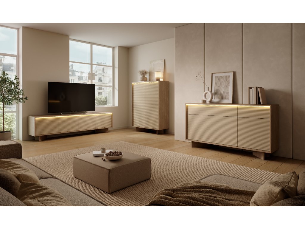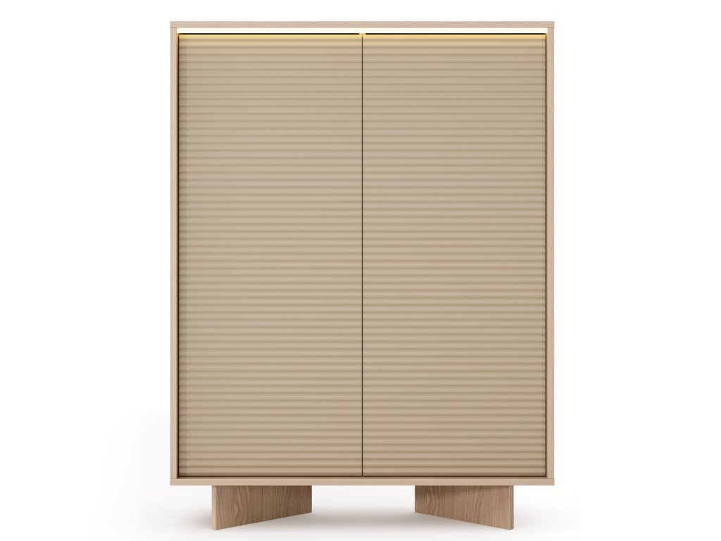 Vysoká komoda s dvomi dvierkami, za ktorými sa nachádza úložný priestor rozdelený policami pre lepšiu organizáciu. Vyhotovená je v kombinácii cappuccino / dub bolivar s MDF frontmi s jemným ryhovaním. Ovládanie je riešené pomocou push-to-open systému bez úchytiek. Súčasťou je aj LED osvetlenie pod hornou doskou.