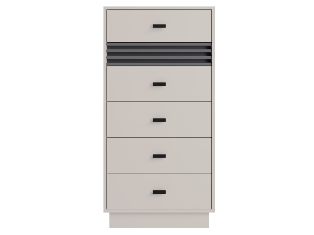 Zásuvková komoda Allmo 18 – béžová s 6 zásuvkami je vysoká a úzká, ideální i do menších prostor. Moderní design v kašmírově béžové barvě s antracitovými lamelami a černými úchyty.