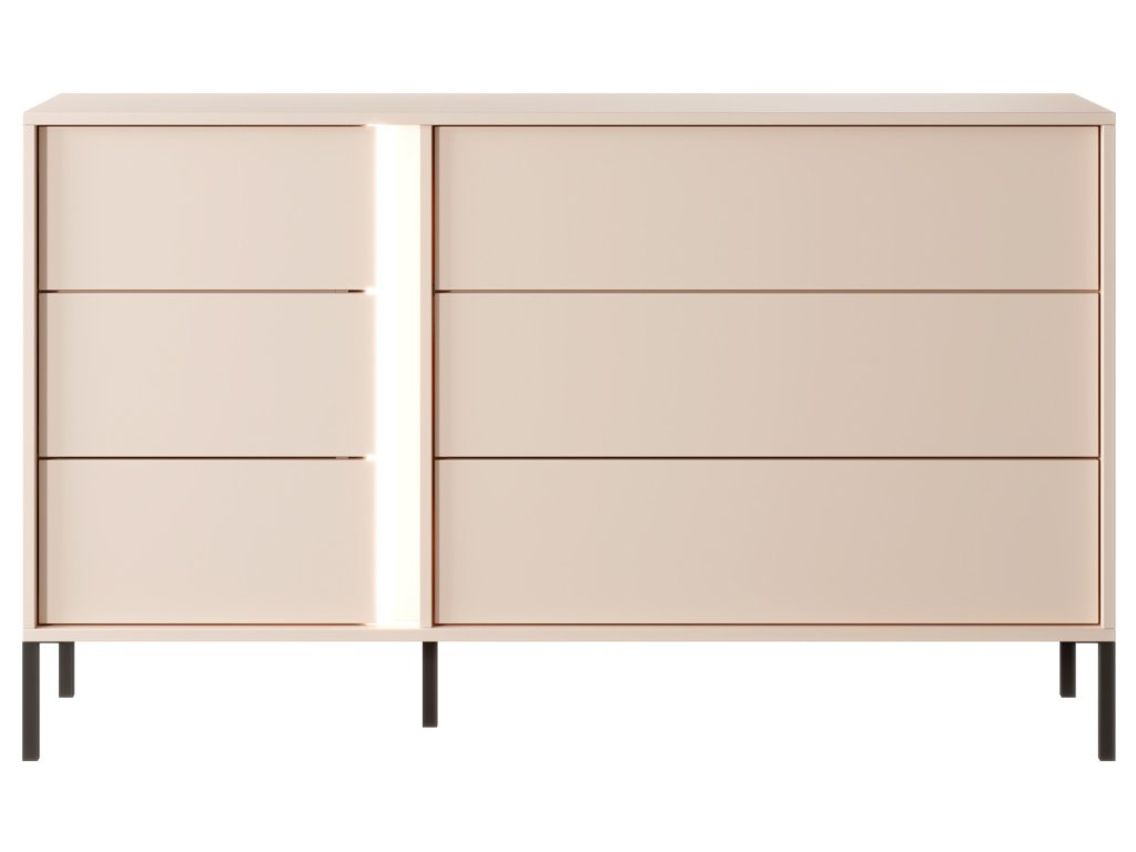 Zásuvková komoda Dast – béžová o rozměrech 137,3 × 39,5 × 81,4 cm nabízí 6 zásuvek – širší na pravé a užší na levé straně a stabilní černé kovové nohy. Moderní design si jednoduše můžete doplnit o LED osvětlení za doplatek. Nosnost komody je 15 kg.