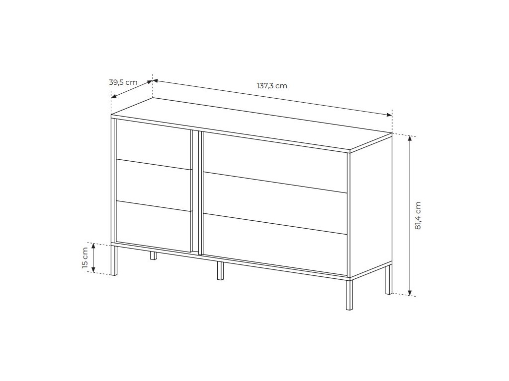 Rozměry komody jsou 137,3 × 39,5 × 81,4 cm, což ji předurčuje jako ideální řešení do ložnice, obývacího pokoje či předsíně. Každá zásuvka je vybavena kuličkovými kolejničkami s plným výsuvem, což zaručuje pohodlnou manipulaci. Nosnost komody je 15 kg, což poskytuje dostatečnou odolnost pro běžné používání.