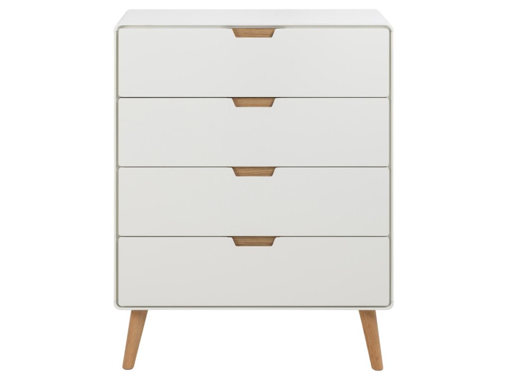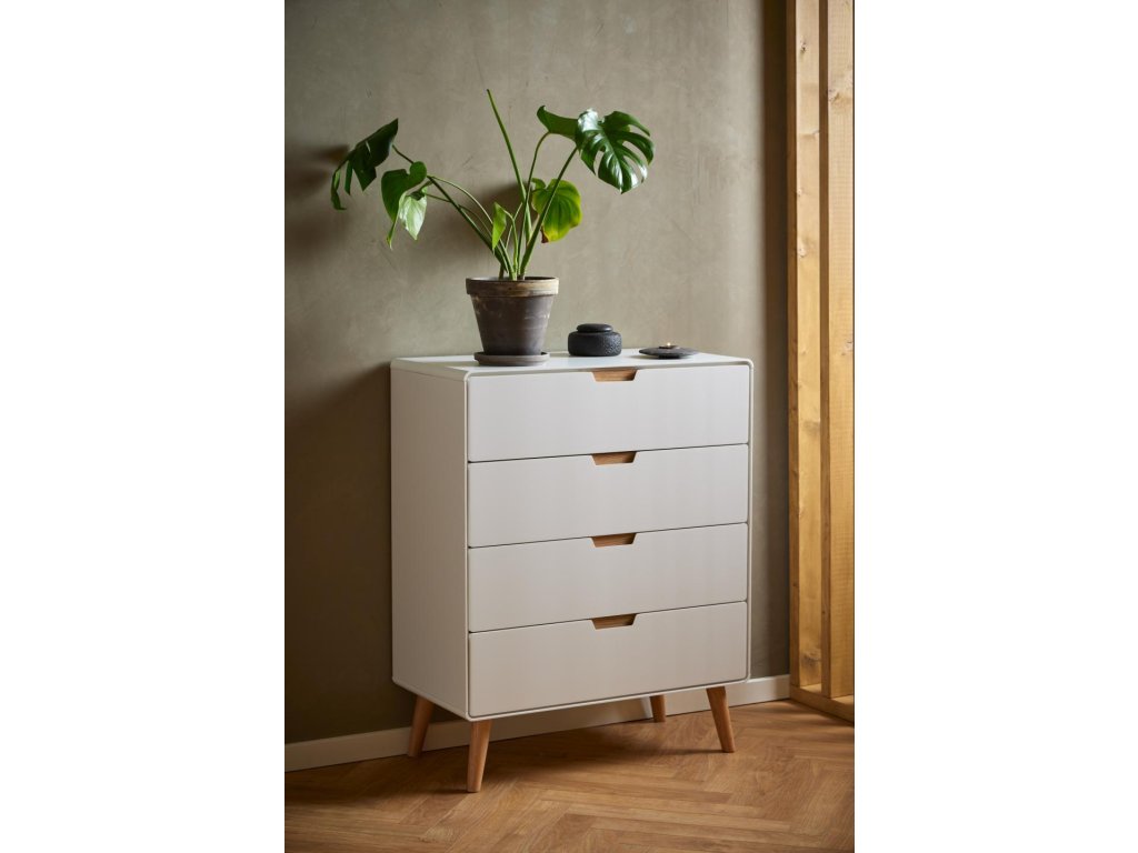 Komoda Lowell nabízí elegantní úložné řešení, které spojuje funkčnost, čistý design a přirozený šarm dubového dřeva. Díky 4 prostorným zásuvkám s měkkým zavíráním poskytuje dostatek prostoru pro oblečení, knihy, hračky či jiné domácí potřeby. Minimalistická bílá povrchová úprava ladí s jakýmkoli interiérem, zatímco dubové nohy a úchyty vnášejí do prostoru teplý, přírodní akcent.