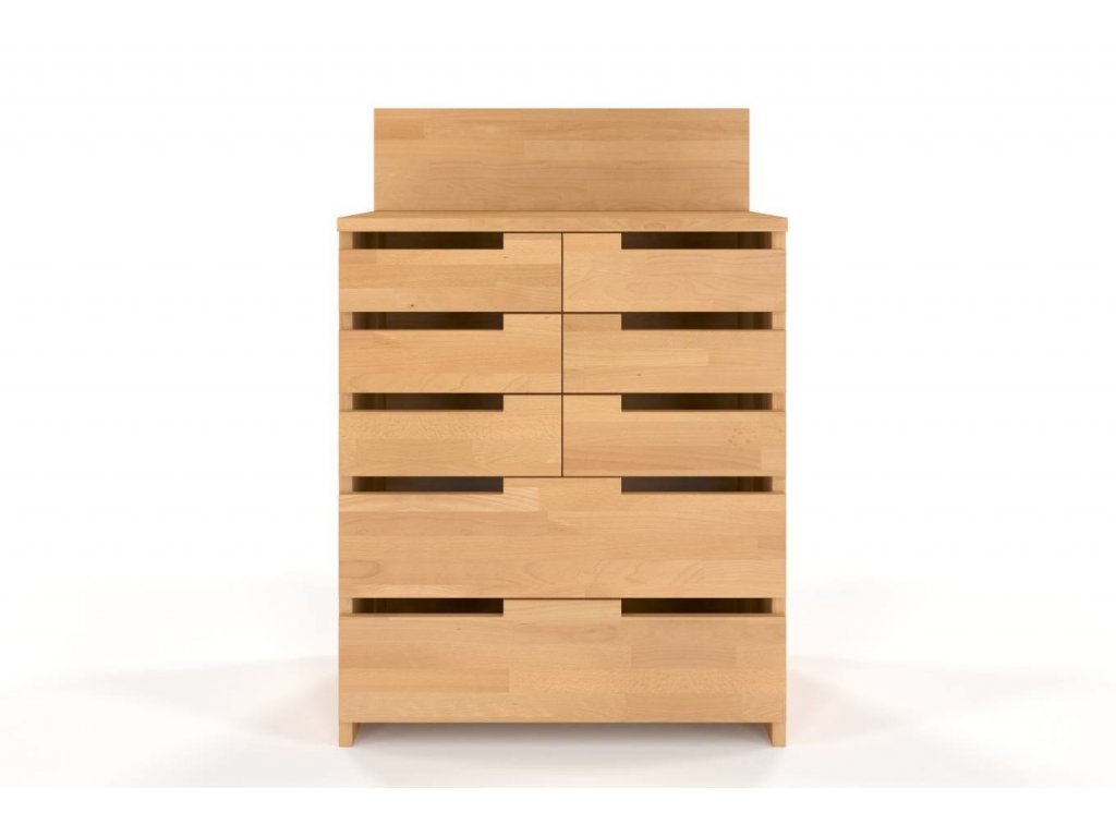Masivní komoda z buku s osmi zásuvkami, které mají široké obdélníkové výřezy místo úchytek. Její neobvyklý design zpestří interiér a zvýšený zadní díl dodá nábytku jedinečný charakter.