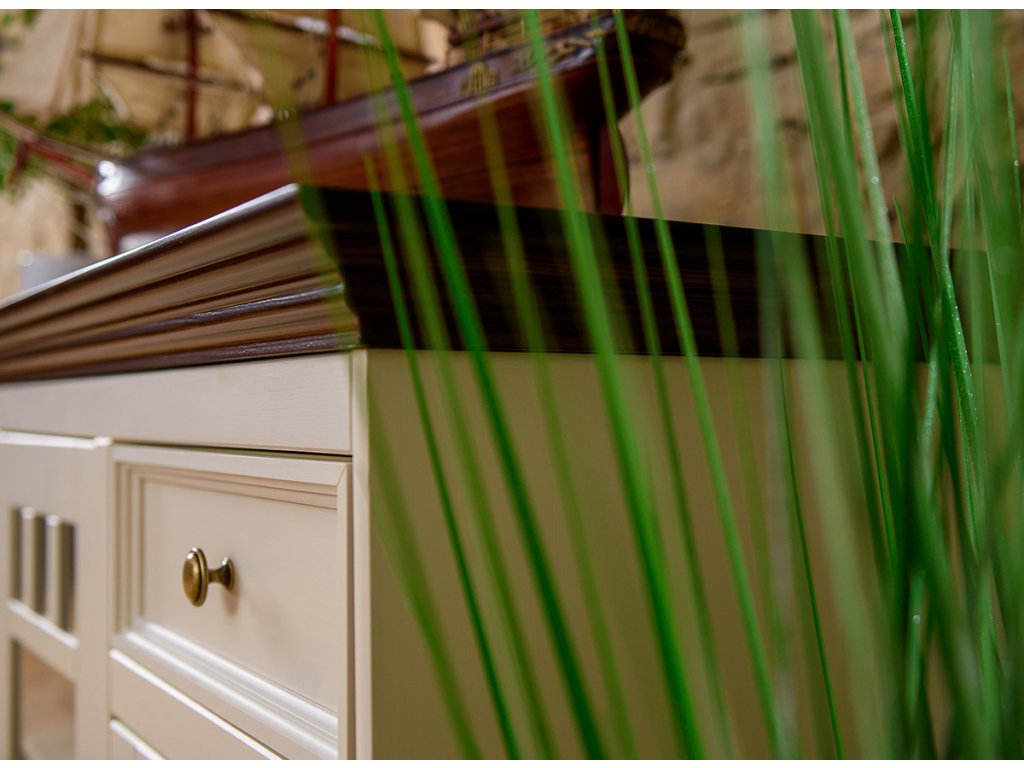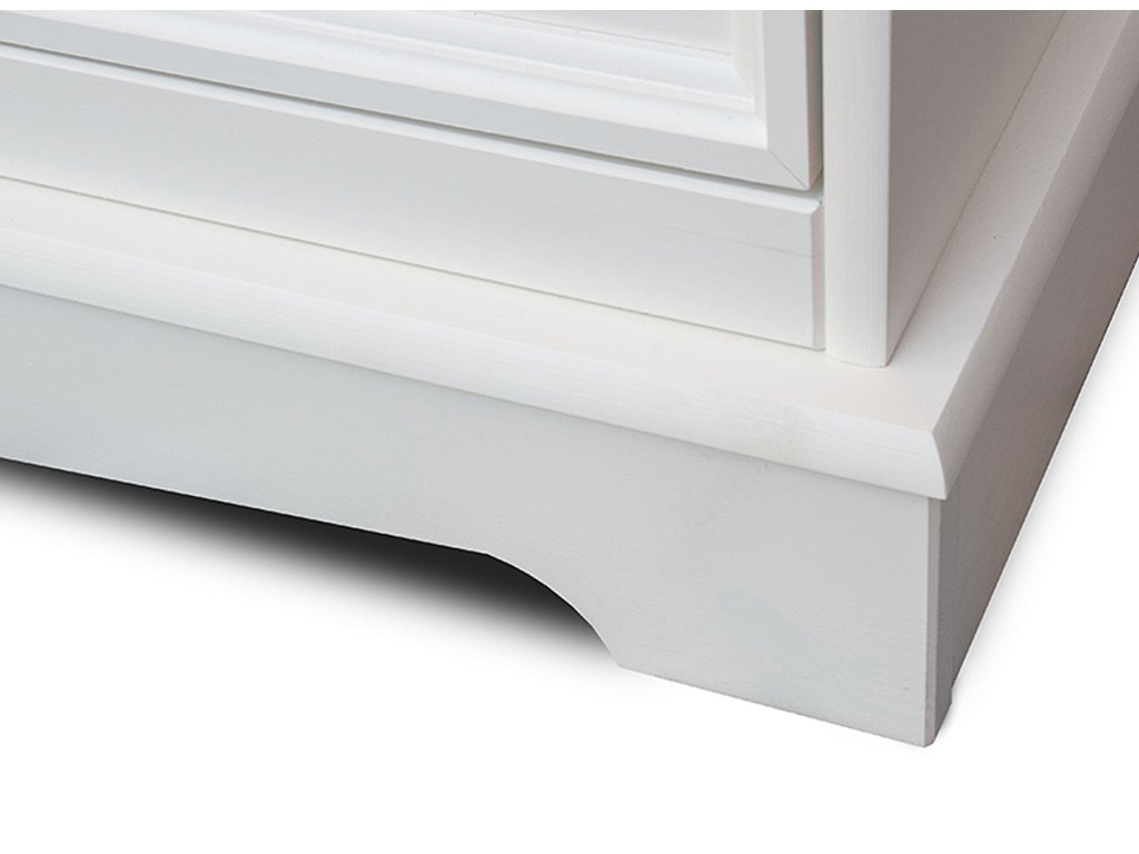 Masivní komoda představuje provensálský styl, který se projevuje v takových detailech, jako jsou výřezy, kovové úchytky a ozdobná horní část a podstavec. Kolekce, ze které nábytek pochází, obsahuje také další barevné možnosti komody a její další rozměry. Bílá dřevěná komoda je uvnitř vybělená, kromě boků zásuvek.