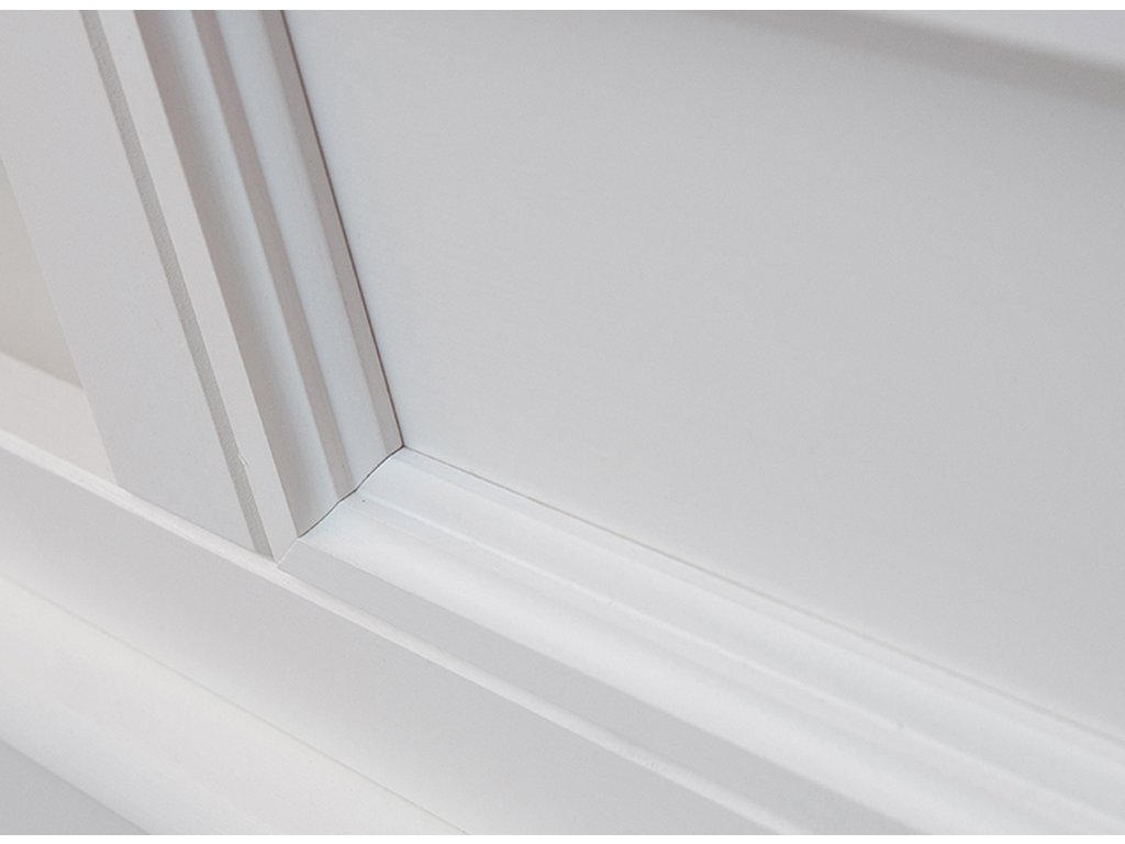 Pokud hledáte poutavou komodu vyrobenou ze dřeva, která není vybavena jen zásuvkami, tato bílá komoda je produkt pro vás. Komoda disponuje prosklenými dvířky uprostřed, do kterých můžete vložit výstavní předměty. Univerzální bílá barva je na povrchu natřena barvou na vodní bázi, přičemž kryje na 85 %, proto pod ní krásně vynikne kresba dřeva.