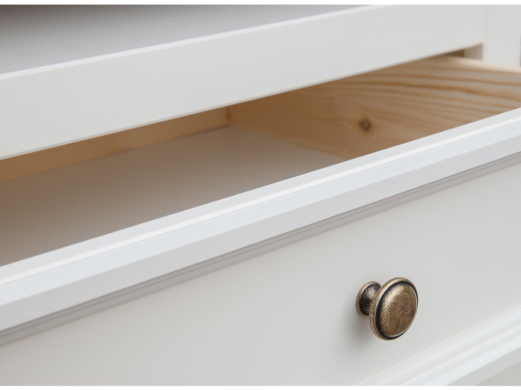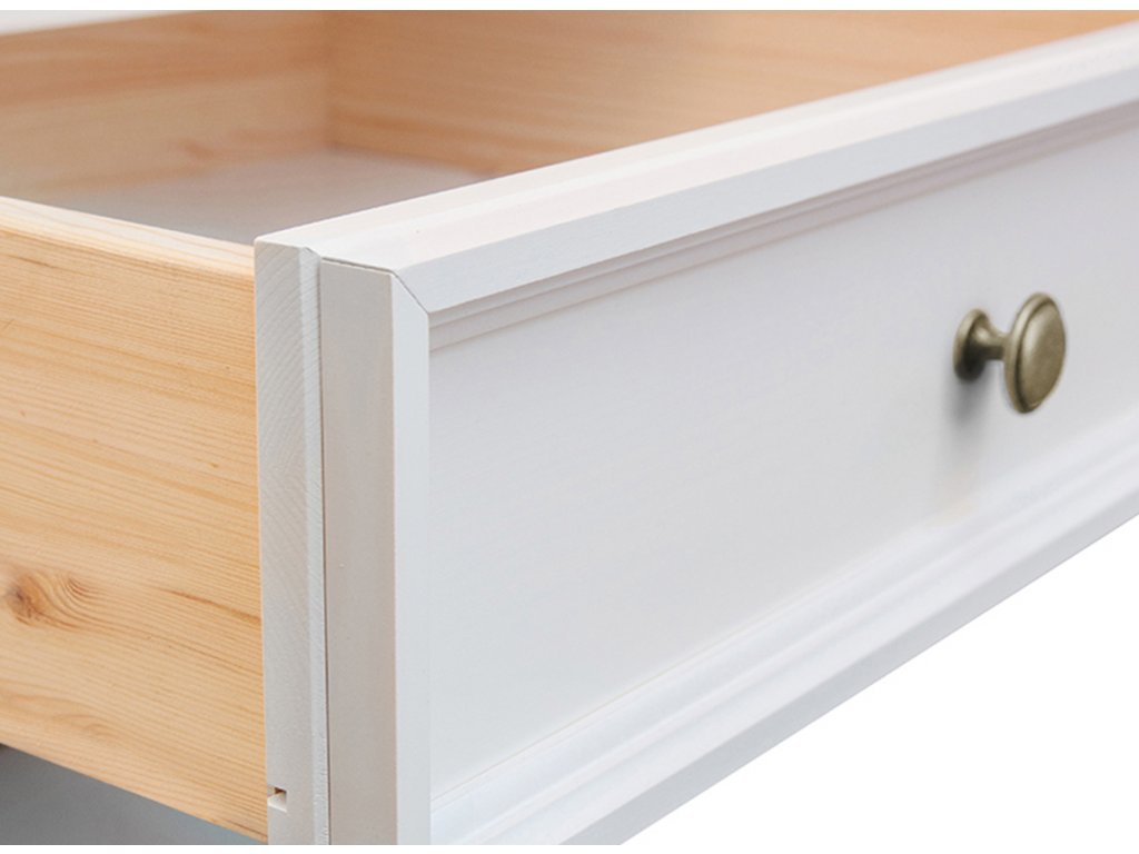 Bílá komoda je vyrobena z masivního dřeva a je odolná vůči poškození. Použité borovicové dřevo je zárukou, že nábytek bude svůj úkol plnit mnoho let. Prsteny ve dřevě viditelné na povrchu dodávají přirozený styl a extravaganci. Vrchní deska komody je v odstínu ořech, mořidlo na vodní bázi kryje komodu na 40 %.