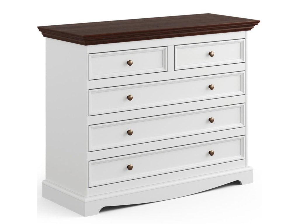 Velká, klasická bílá komoda s 5 zásuvkami je ideální volbou do ložnice, obývacího pokoje i předsíně. Prostorné zásuvky jsou vybaveny systémem tichého zavírání. Použité borovicové dřevo je zárukou kvality a trvanlivosti a pečlivá povrchová úprava zajišťuje estetický vzhled nábytku. Komoda je mimořádně praktická. Dvě z pěti zásuvek jsou o něco menší, zatímco ostatní tři jsou široké a prostorné. Každá zásuvka je ozdobena výřezy.