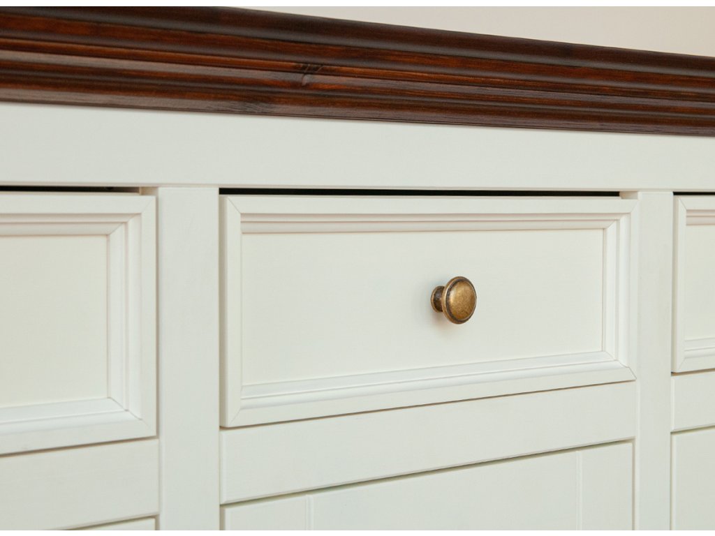Komoda z borovice se skládá ze 3 pevných zásuvek vybavených systémem tichého zavírání. Následují tři skříňky, do kterých můžete skrýt kuchyňské nádobí nebo kancelářské doplňky. Masivní komoda Bellu se vyznačuje i smyslem pro každý detail. Staré zlaté úchyty, jemné zářezy na dveřích a ozdobná spodní lišta dodávají celému nábytku jedinečný vzhled.