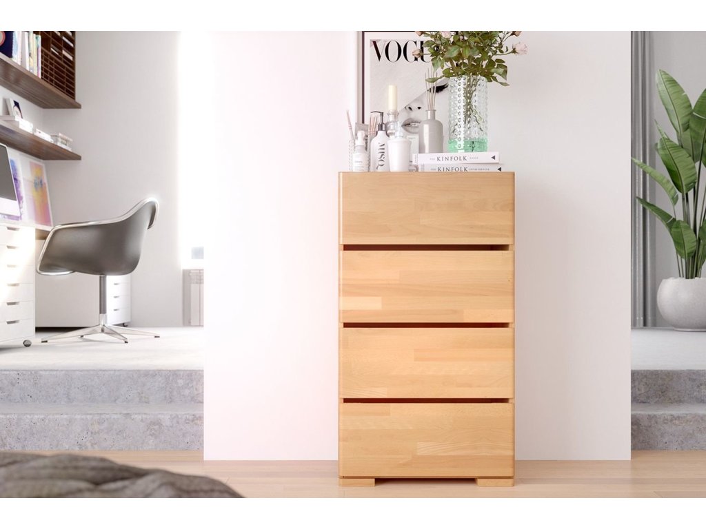 Dřevěná komoda potěší 4 zásuvkami se systémem tichého zavírání a vhodnou šířkou 60 cm. Má hladkou přední část, jednoduchou formu a žádné úchytky. Nejharmoničtější atmosféru v interiéru vytvoří spolu s ostatním nábytkem z kolekce Sandemo.