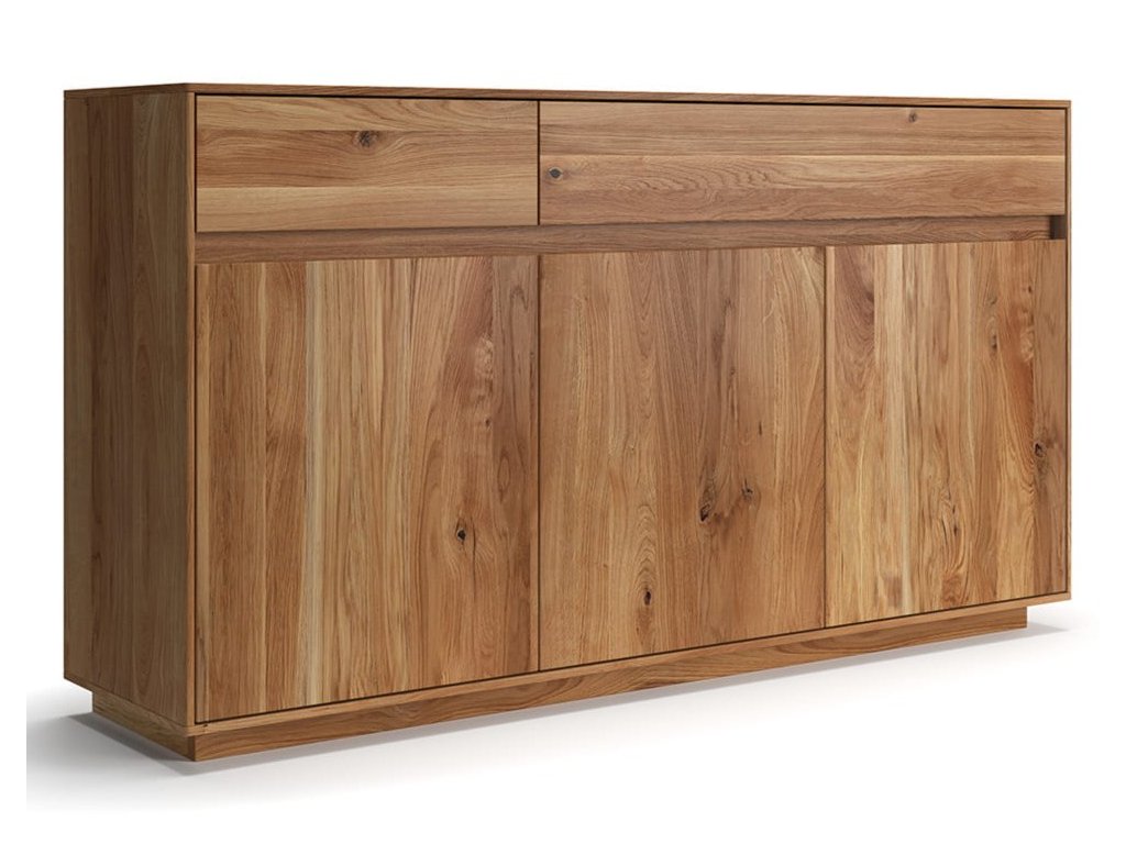 Široká komoda Sora z dubového dřeva je harmonický a vyvážený kus nábytku, který staví na čisté síle masivního dubu bez zbytečných ozdob. Jednotný přírodní odstín dřeva, výrazná struktura a hladké čela bez úchytek vytvářejí lehký, vzdušný dojem, který se přirozeně hodí jak do velkých, tak do menších interiérů. Každý prvek komody je vyroben z masivního dubu a ošetřen přírodním olejem Hesse, který chrání povrch a zároveň umožňuje dřevu přirozeně stárnout a získávat charakter. Praktický vnitřní design zahrnuje dvě prostorné zásuvky s kolejničkami Hettich s mechanismem soft-close a tři dvířka, za nimiž se nachází úložný prostor rozdělený dvěma policemi. Komoda nabízí velkorysý prostor pro každodenní úložné potřeby a zároveň poskytuje horní plochu ideální pro dekorace nebo techniku. Díky svému nadčasovému designu je vhodná do obývacího pokoje, předsíně i domácí kanceláře.
