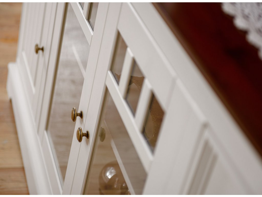Ve střední části nábytku je police rozdělena na dvě části. Díky tomu, že je umístěna za sklem, můžete vystavit například svoji oblíbenou sbírku skleniček, aniž byste se museli obávat, že je budete neustále oprašovat. Toto řešení dodává dřevěné prosklené komodě individuálnější vzhled. Bílá komoda má stříbrné úchyty, stejně jako ozdobnou horní horní a spodní kolejnici. Celé to vypadá velmi uceleně a elegantně.