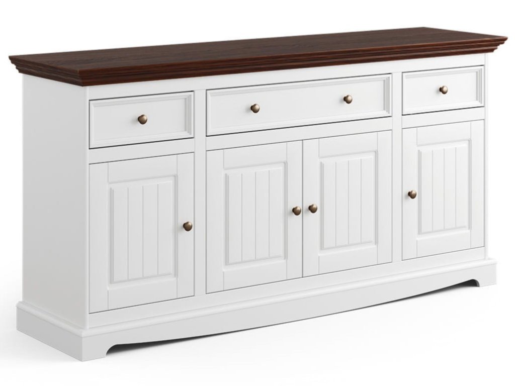 Bílá dřevěná komoda má za dvířkami 4 prostorné police. Čtyřdveřová komoda byla doplněna o kovové úchyty na dveřích a zásuvkách, které jí dodávají na eleganci. Vrchní část komody je v barvě ořech.