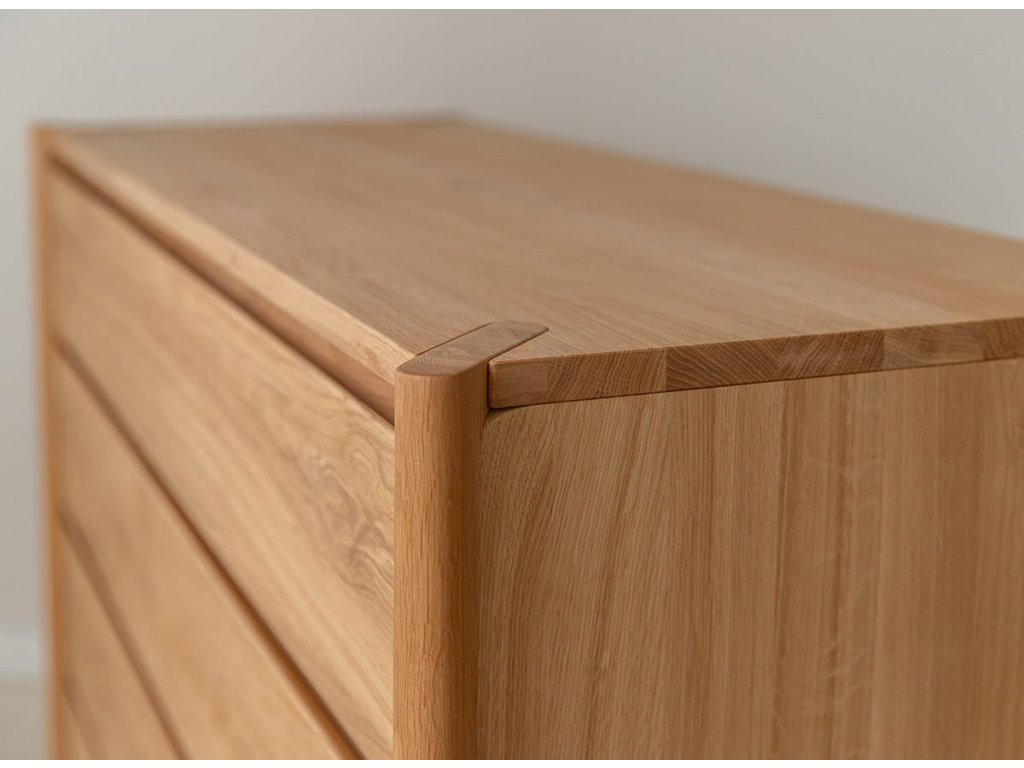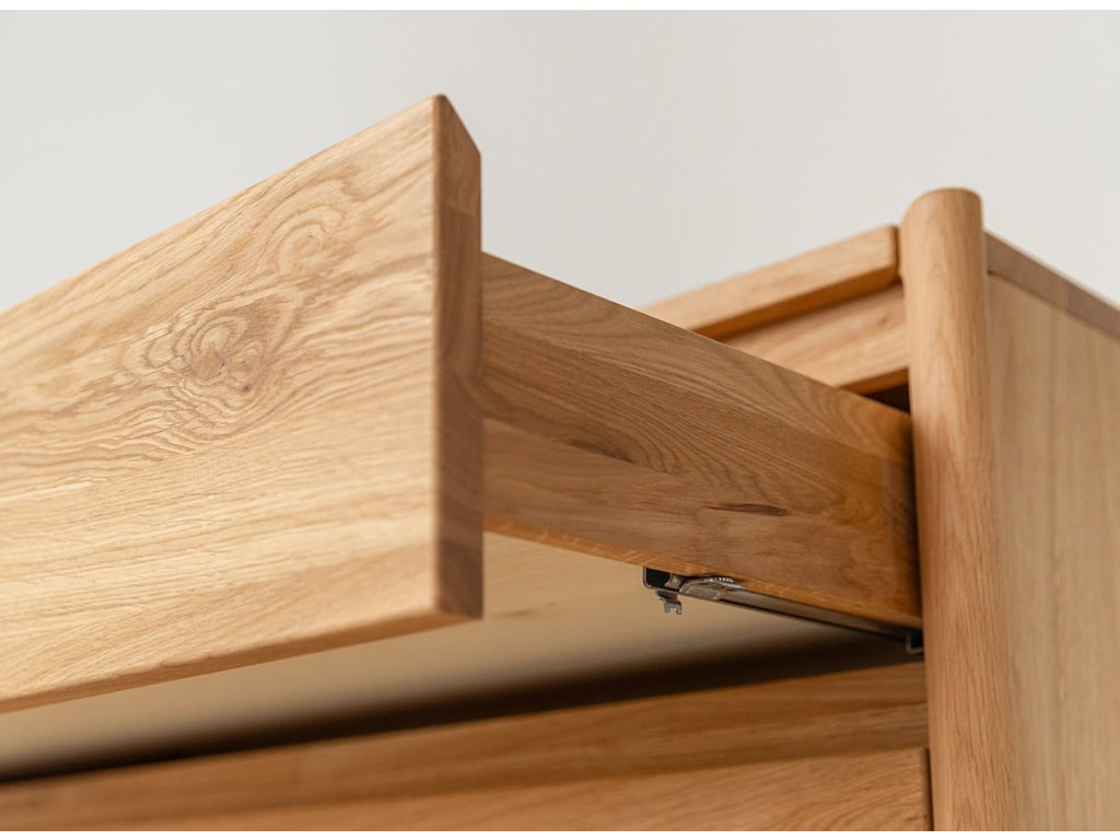 Masívna dubová komoda z kolekcie Campi vyniká minimalistickým dizajnom s frézovanými čelami bez úchytiek, ktoré podčiarkujú jej moderný vzhľad. Je vyrobená z prírodného dubového dreva s olejovanou polomatnou povrchovou úpravou, ktorá zvýrazňuje kresbu dreva a zároveň ho chráni. Ponúka 4 priestranné zásuvky s kvalitným pojazdom Hettich s tlmeným dovieraním, čo zabezpečuje komfort pri každodennom používaní. Vďaka pevnej konštrukcii a nadčasovému vzhľadu sa hodí do moderných aj škandinávskych interiérov.
