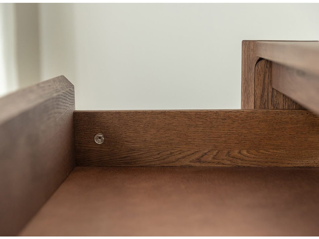 Celá séria je vyrobená z kvalitného dubového masívu, ktorý vyniká dlhou životnosťou. Konečná úprava olejovaním v polomatnom prevedení zvýrazňuje prirodzenú kresbu dreva, chráni povrch a zachováva jeho autentický charakter. Kolekcia je dostupná v dvoch farebných variantoch – prírodný dub a tabakovo hnedá.